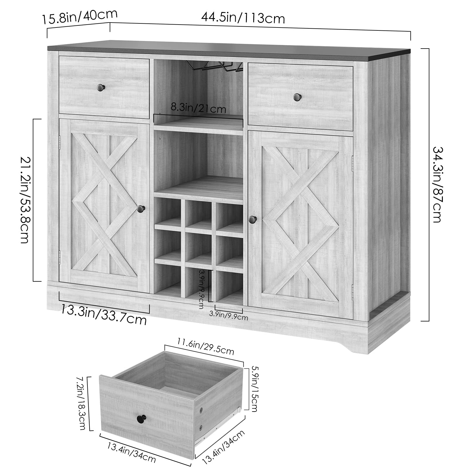 - MORE DETAILED -- Comes with detailed instructions, this wine bar storage cabinet can be easily assembled. With a size of 44.5W * 15.8D * 34.3H inches, this buffet cabinet with storage takes up a small amount of space and allows for unlimited possibilities.