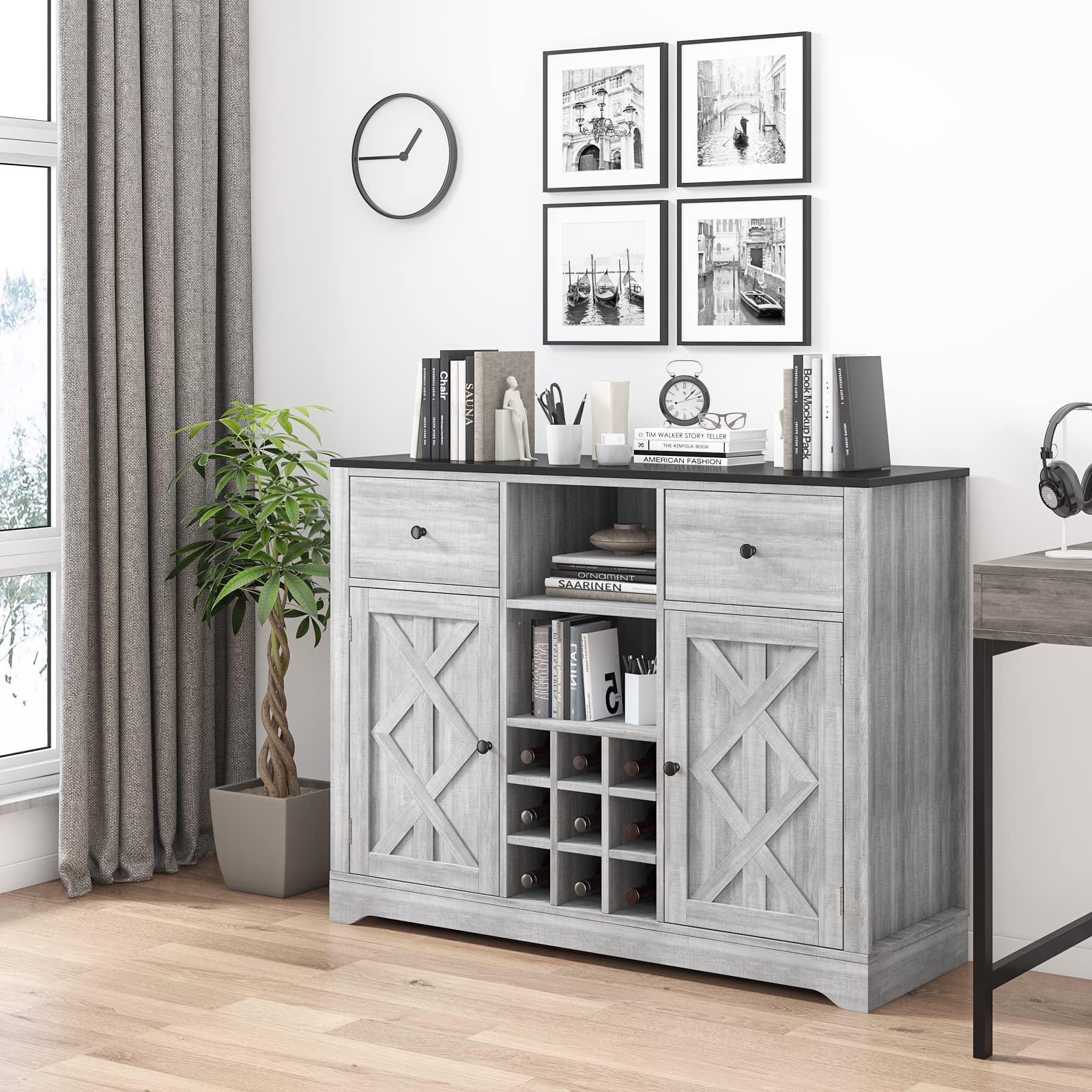 - MORE STORAGE -- This buffet cabinet is designed with a flat and spacious table top, 2 open shelves, 9 compartment wine rack, 2 drawers, and 2 side cabinets with doors, this sideboard buffet cabinet provides you with enough space to store your wine, tableware or personal items to maximize your storage needs.
