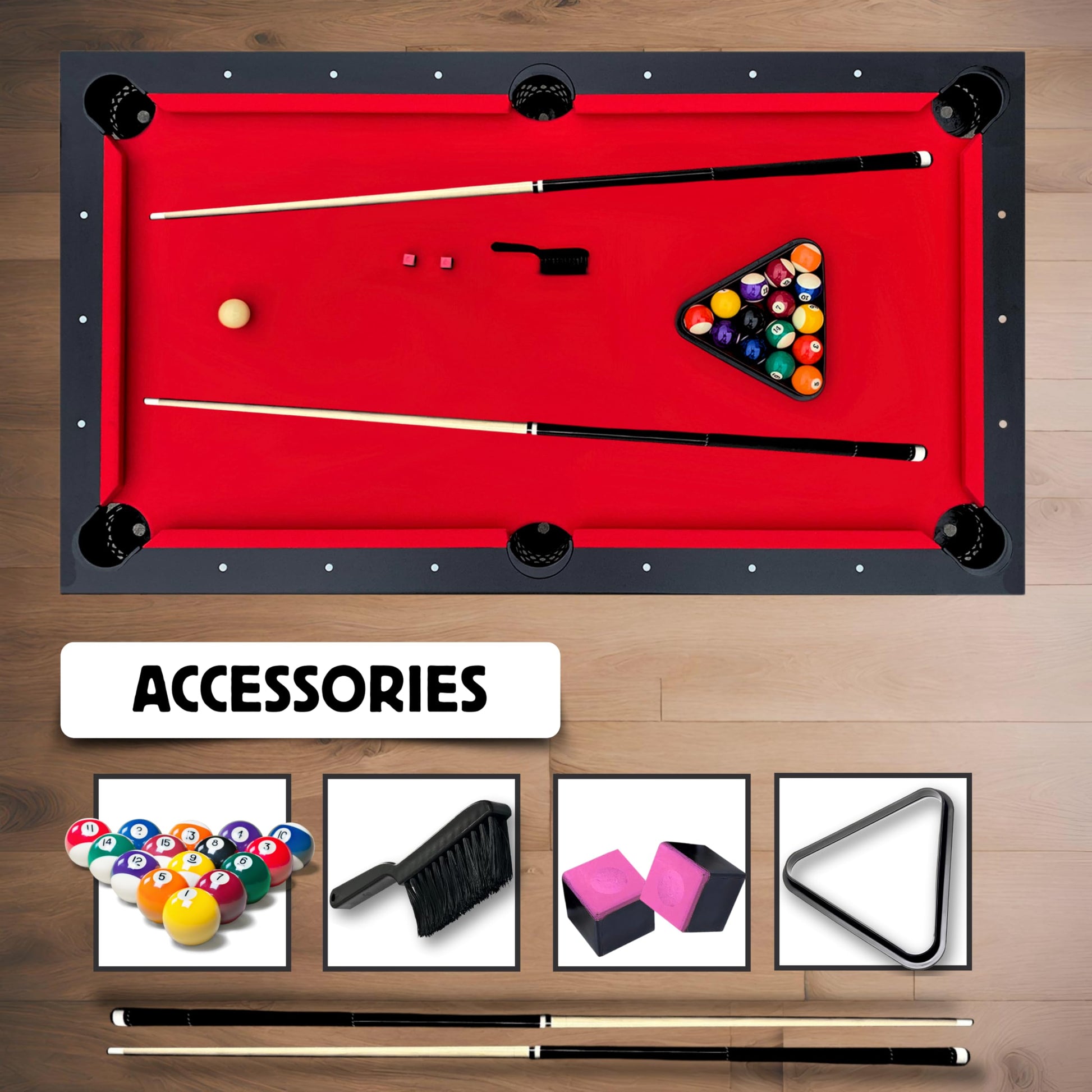 - COMPLETE SET: (2) 58-inch two-piece pool cue sticks, premium grade billiard balls, ball rack, rail brush, and 2 pieces of color matched chalk
