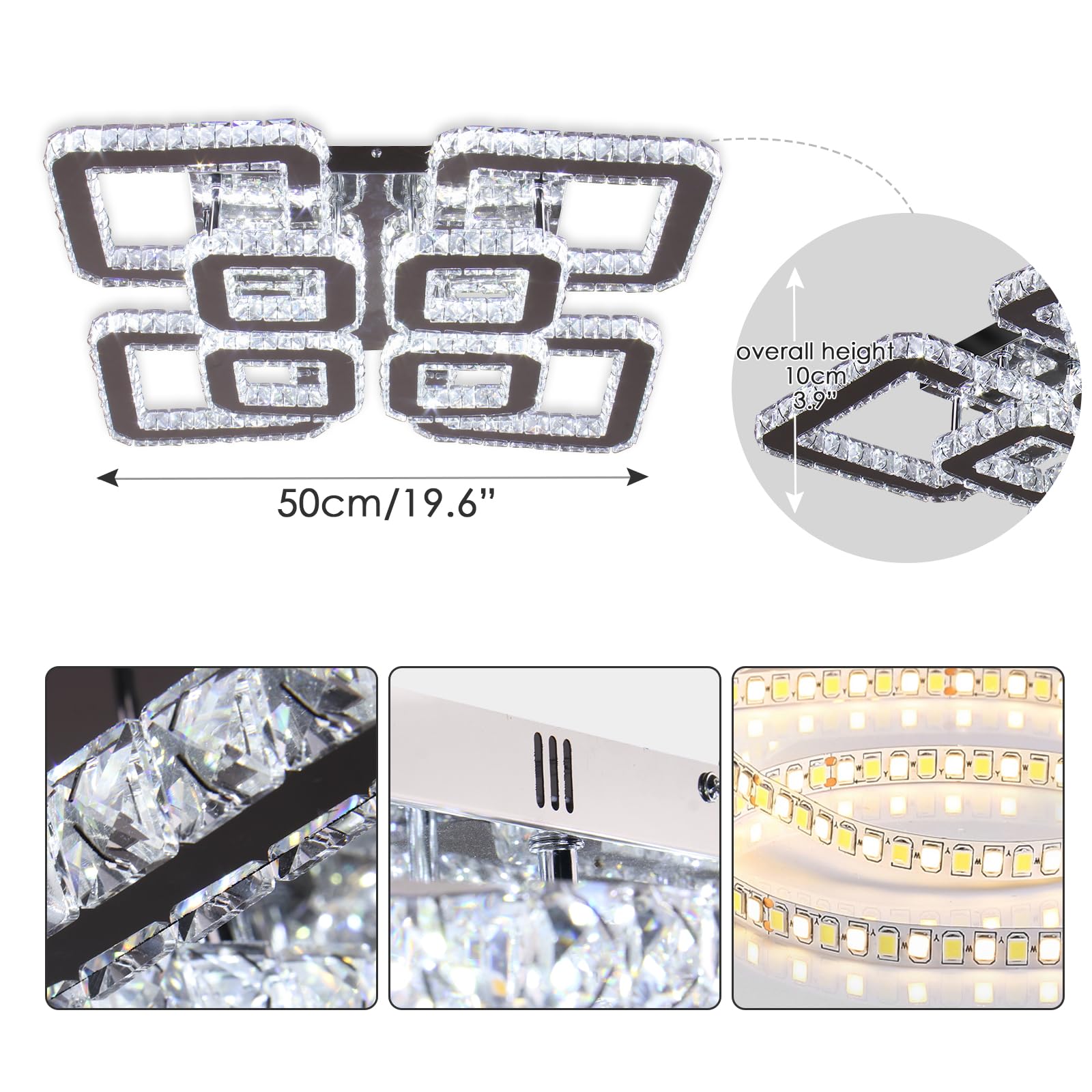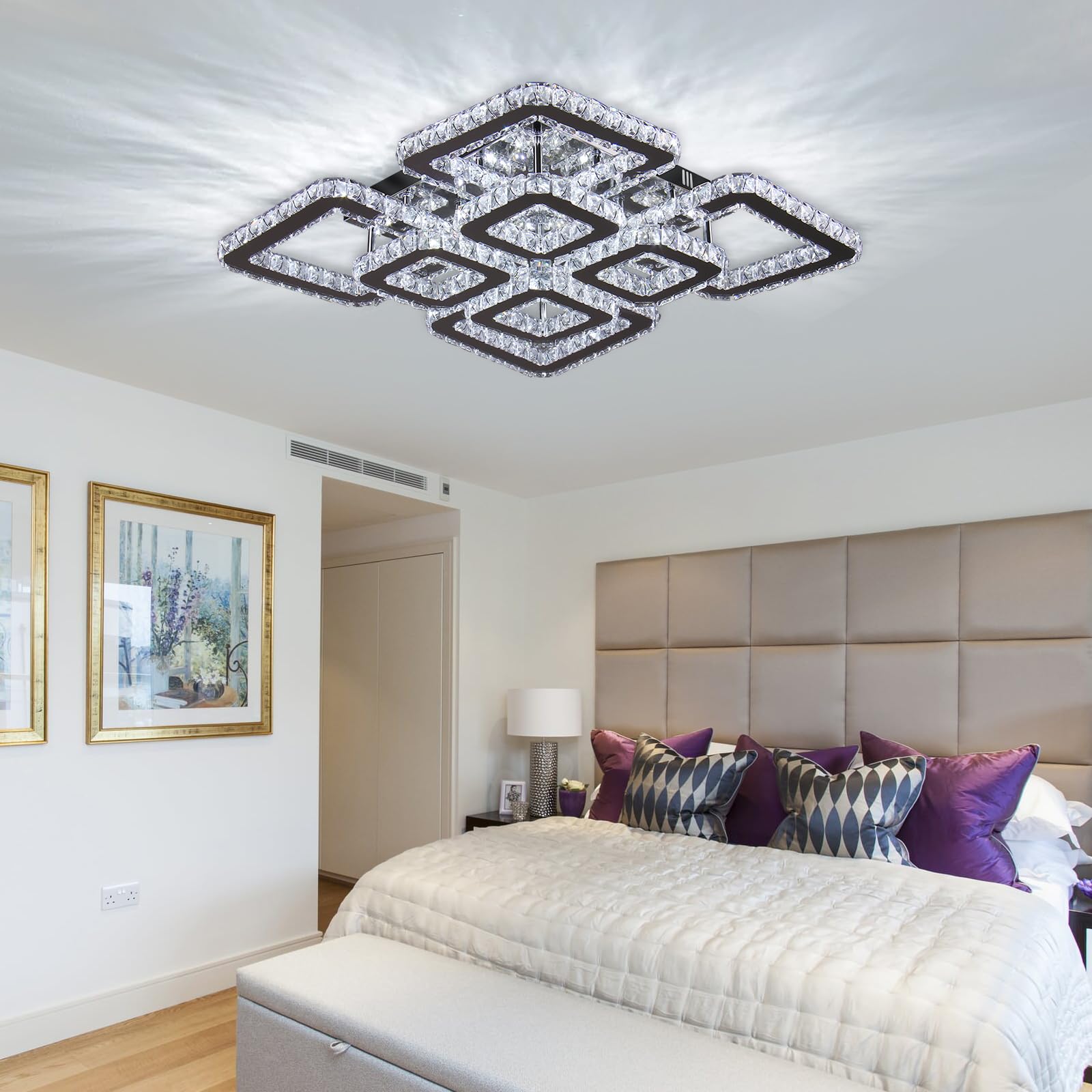 - Crystal Chandelier: Unique design, very suitable for home decoration, 8 square crystal rings bring you bright and shining light, giving the entire room an elegant temperament. Cool White (4500K-6500K),Not Dimmable