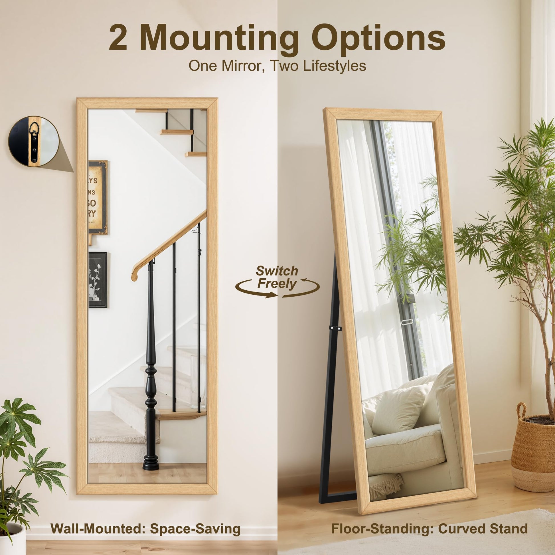 - Dual functionality: use as floor mirror with stand or mount on wall/door