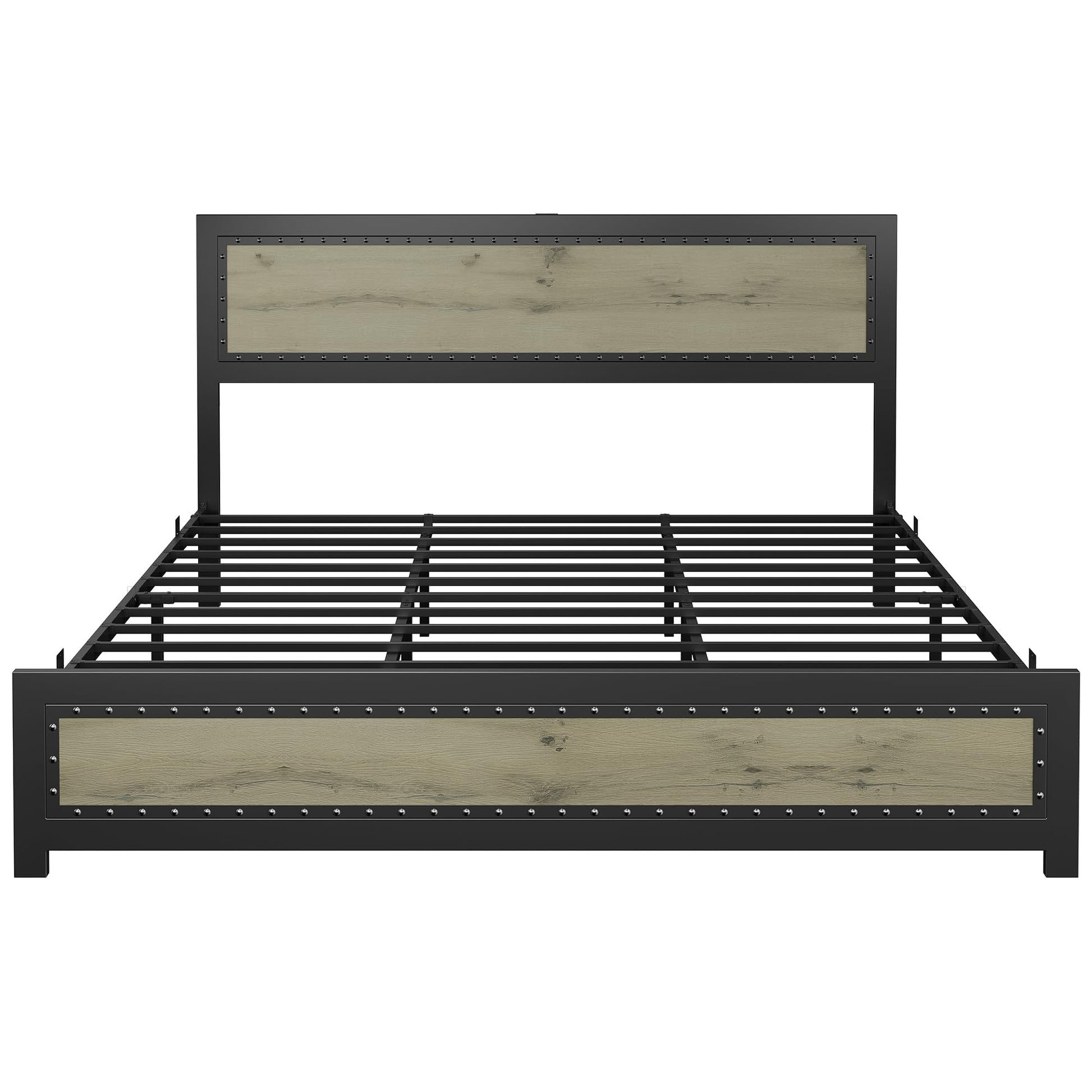 - Constructed from heavy-duty steel slats, our bed frame is designed to prevent sagging and support up to 1000lbs. With 9 support legs and 12 sturdy steel slats, alongside an industrial wooden grain headboard and footboard, your mattress has never had better support.