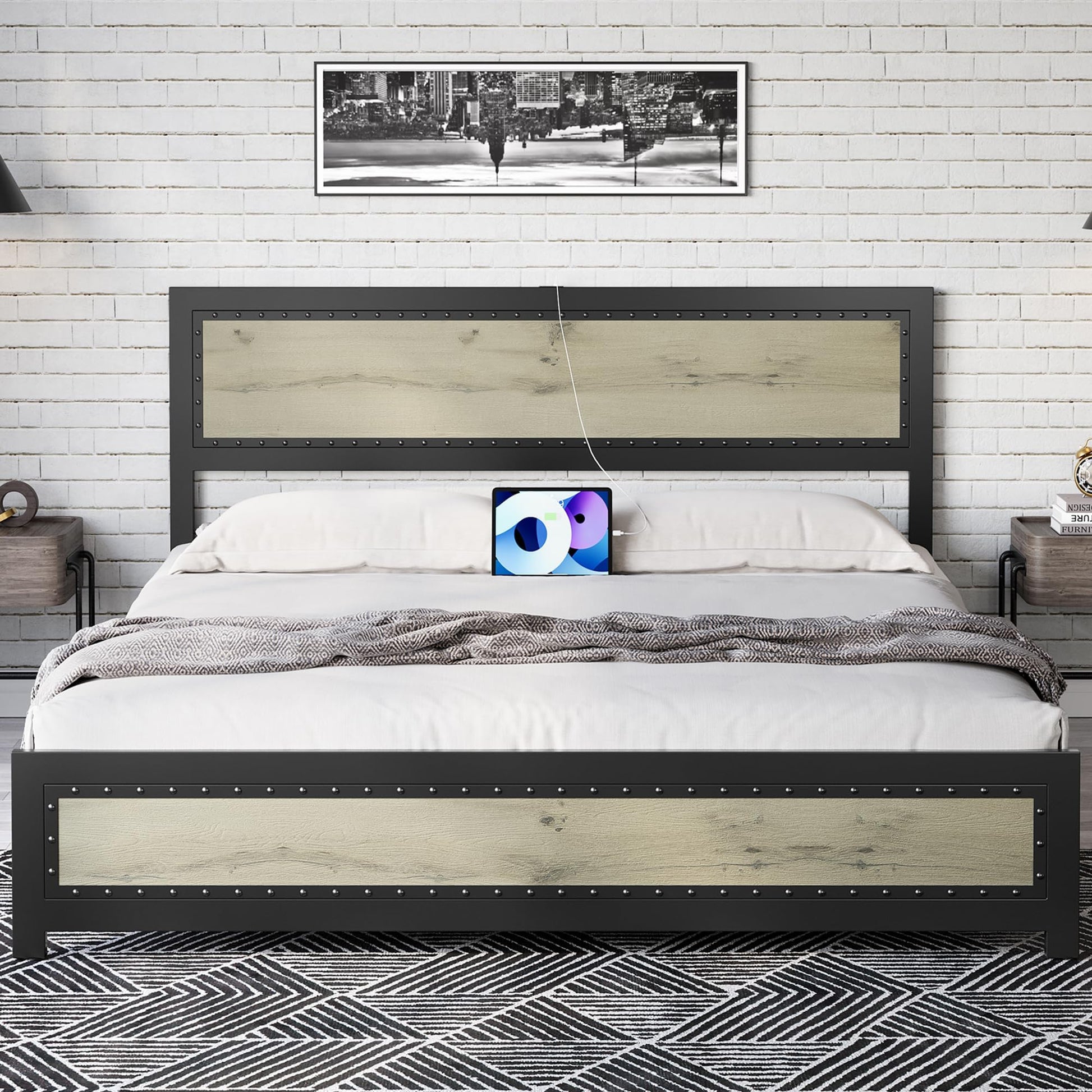 - Modern living meets vintage design with a rechargeable headboard featuring 1 USB port and 1 Type C port. Our bed seamlessly integrates technology into your sleep space, ensuring your electronic devices are always charged and within reach.
