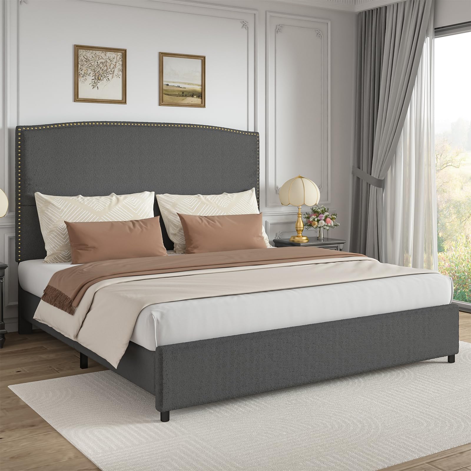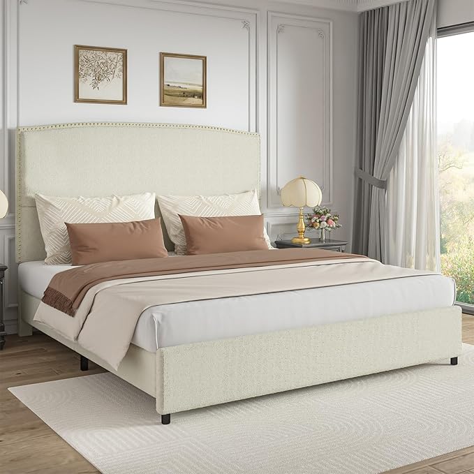 - 56.3" Tall Bed Frame: No more leaning against cold walls! Our upholstered bed frame features a tall headboard wrapped in soft boucle fabric, giving you plush back support while reading or watching movies