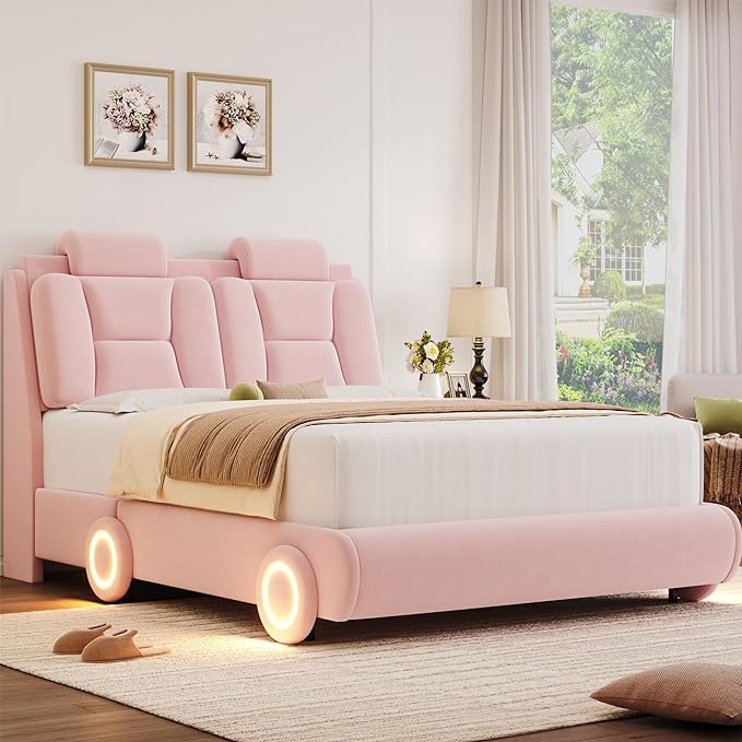 - LED Bed frame with Wheel Decor The bed frame is equipped with 4 wheels with RGB light strips which can be controlled by an app or remote control to freely switch the light color, brightness, mode, and timer function. This LED bed frame looks very cool and creates your favorite room atmosphere. Note: The wheels are fixed and cannot be moved