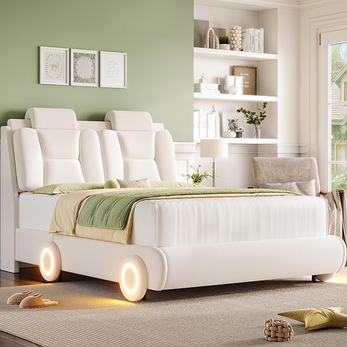 Special Feature | No Box Spring Needed, Sturdy Construction, LED Wheel Decor, 2 Removable Pillows, Adjustable Curved Headboard |