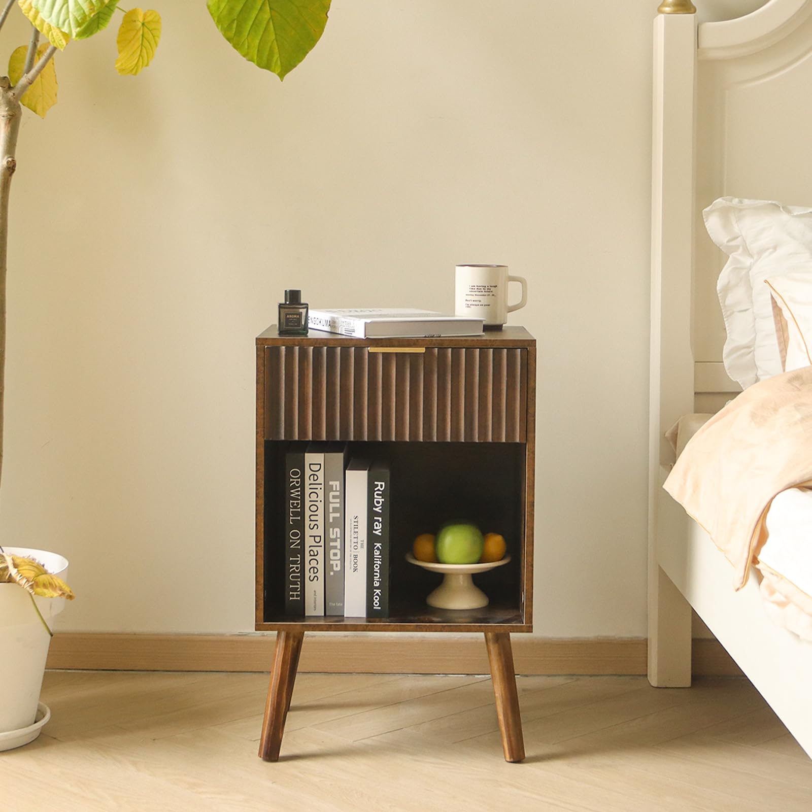 - Chic Fluted Nightstand: The charming walnut grain, smooth surface, metal handle, and curved drawer create this mid century modern nightstand. The fluted drawer is corrugated, which makes this wood bedside table more unique and stylish, while the metal drawer handle matches natural legs, and exudes a vibe of elegance