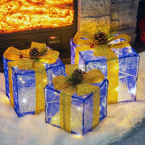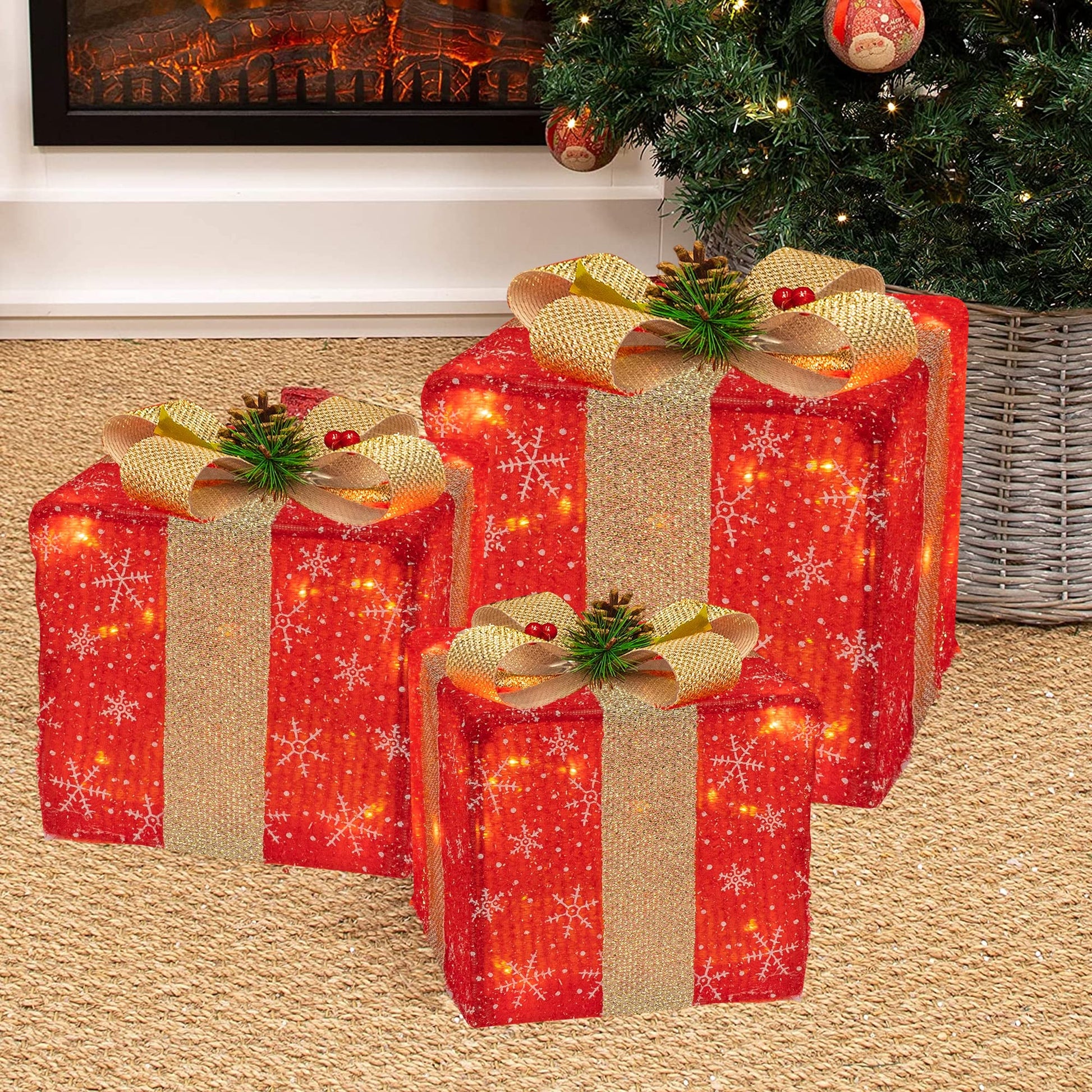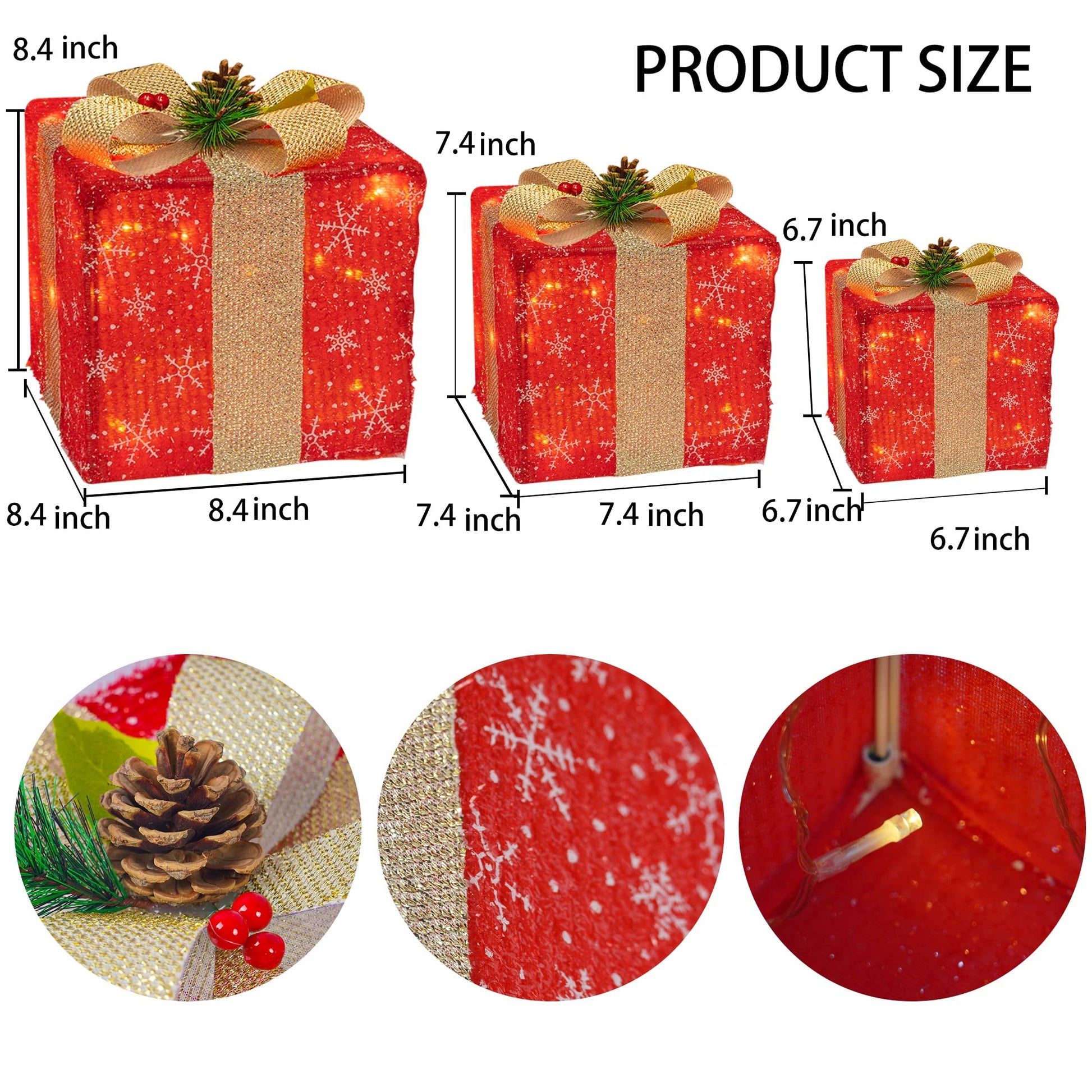 - Christmas Lighted Gift Box: 3 sets of exquisite lighted red present boxes (with glitter ribbon bows red berries, and pine cones) are the best choice for Christmas, weddings, banquets, anniversaries, and Christmas decorations for houses, offices, restaurants, hotels, bars, etc. Decorate these beautiful lighted Christmas packages in your home, they will be the perfect Christmas decoration for your home or yard.