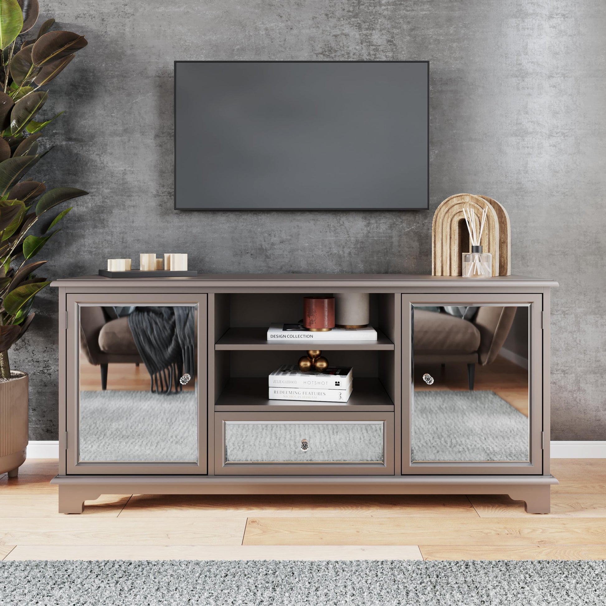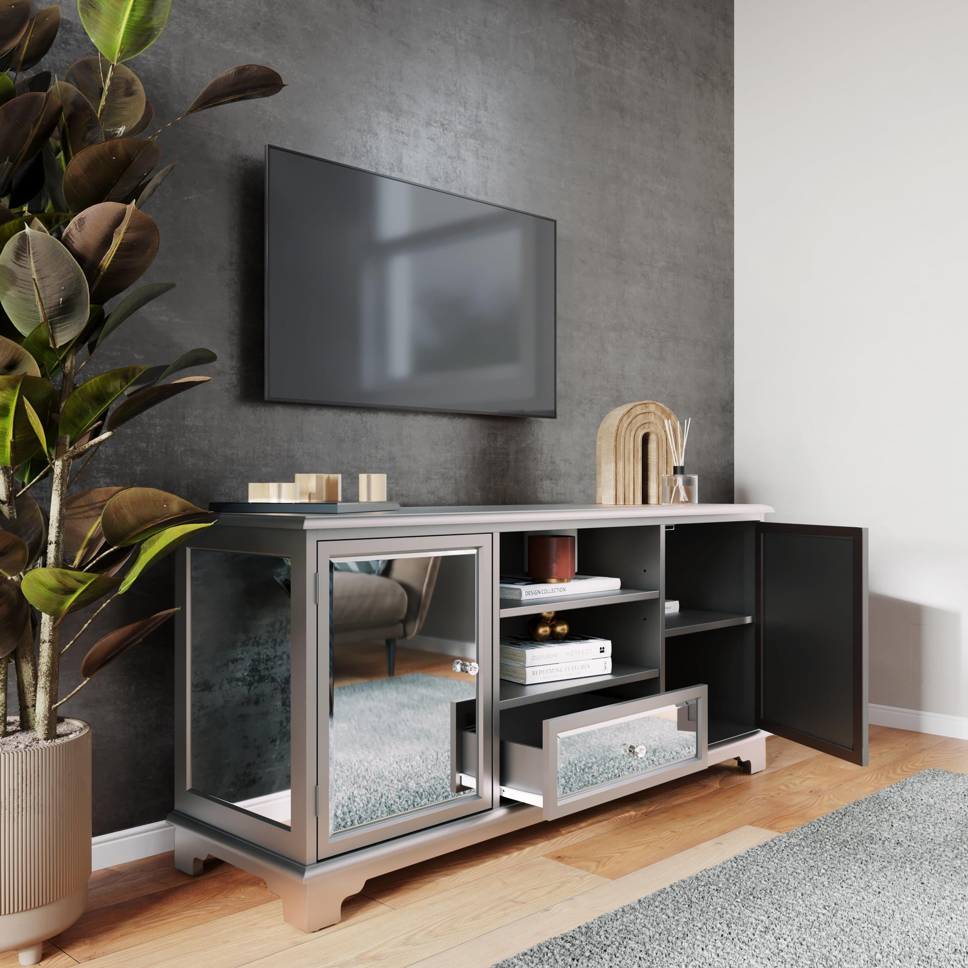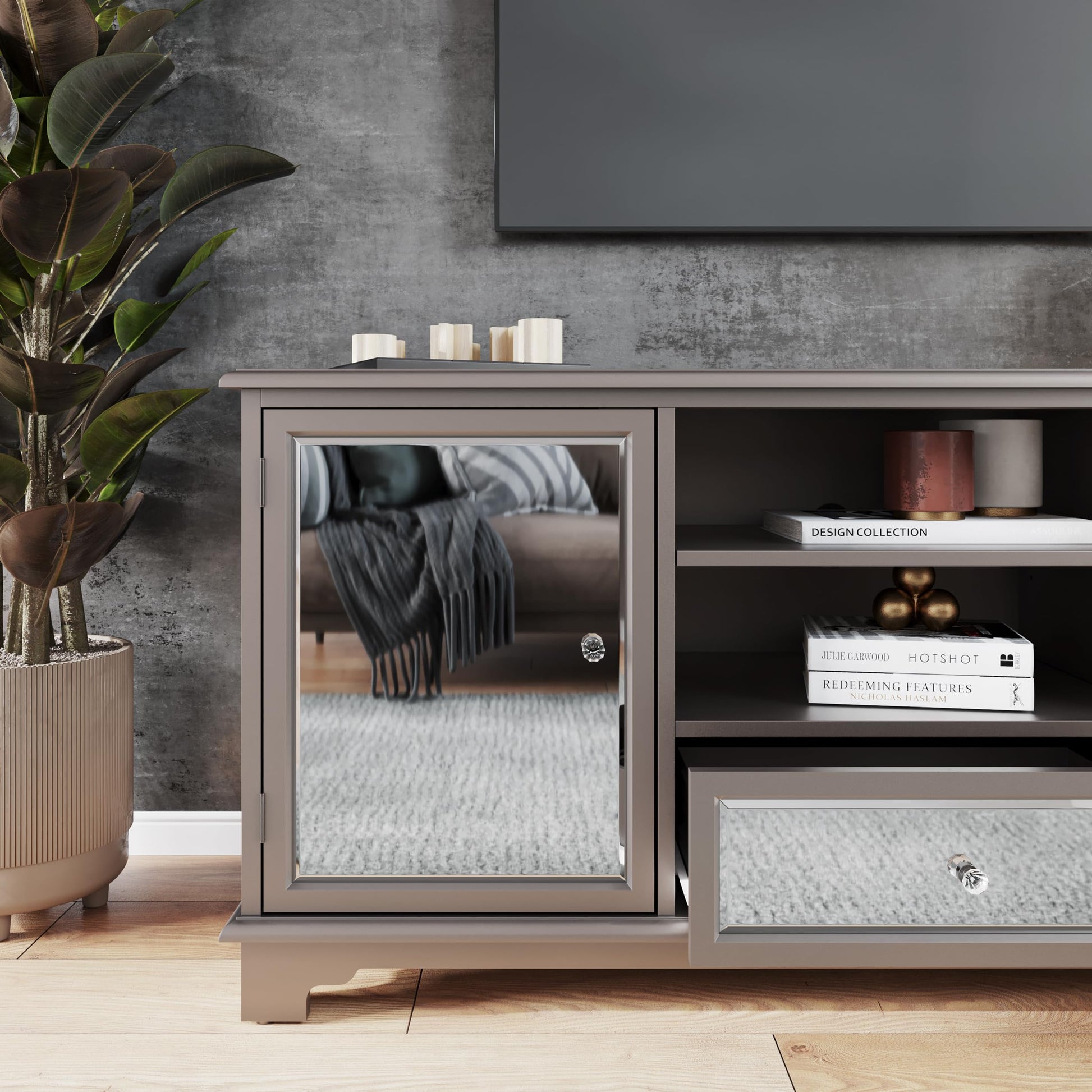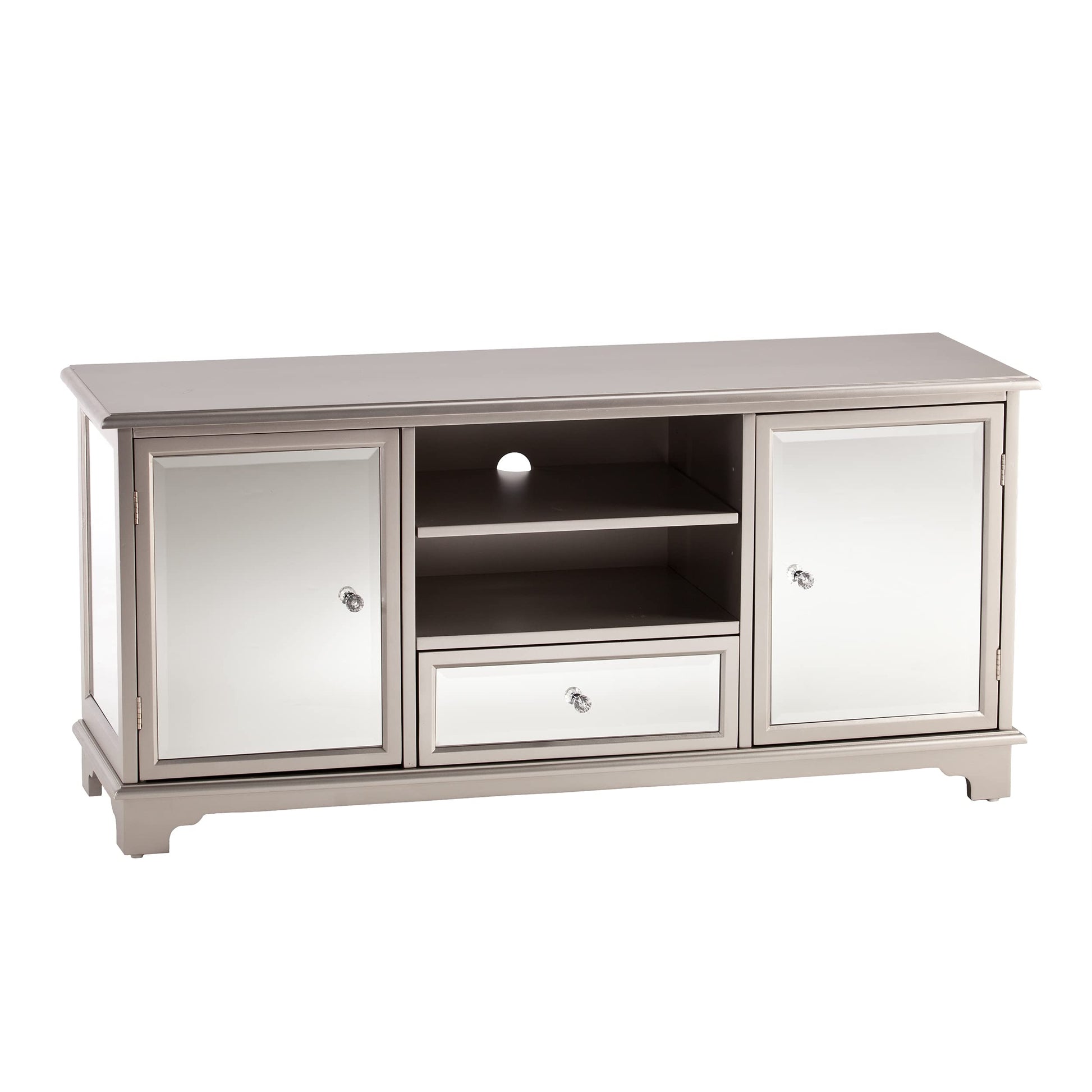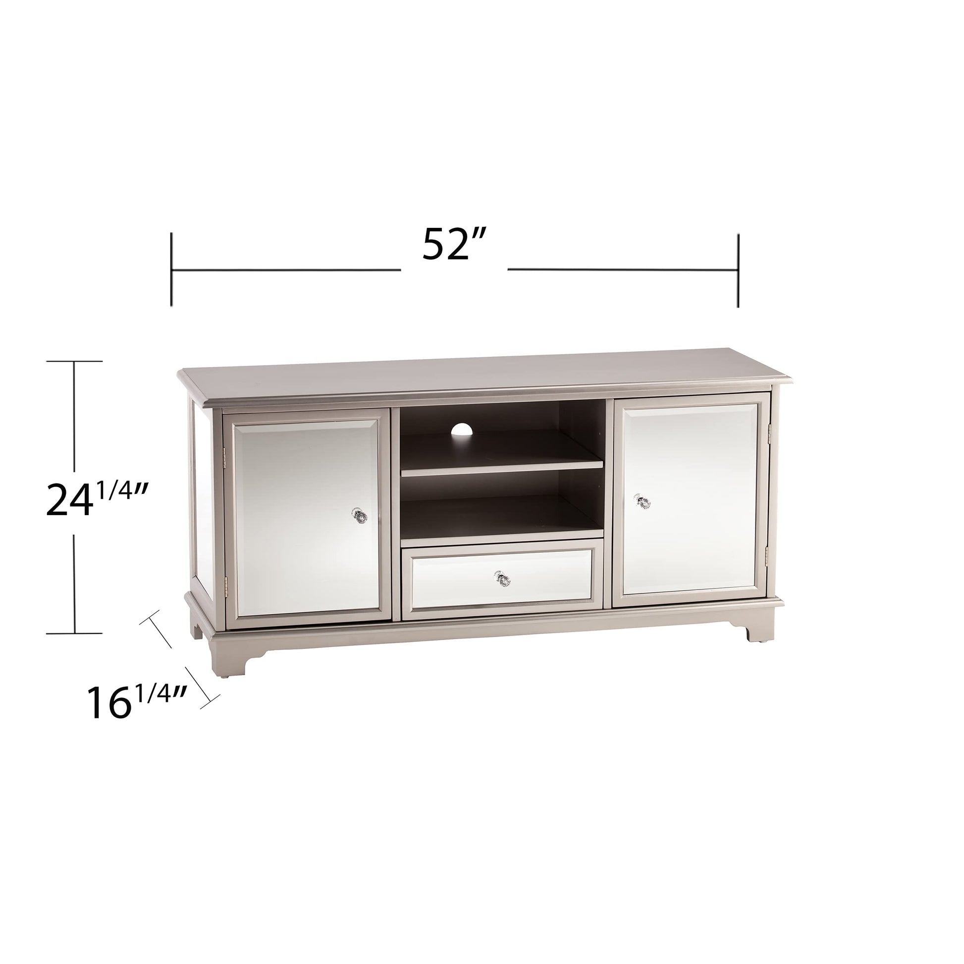 - Add some allure to your living room with this glamorous, mirrored media stand. Silver-painted finish, beveled mirror accents, and crystal-style knobs create a contemporary look that brightens any room. Ample storage includes one drawer, an open center area, and two cabinets for housing everything from games to electronic components. This spacious media stand is the ideal entertainment solution with a chic design. This item accommodates a flat panel TV up to 50" W overall. In addition to that, it offers 2 cabinets, 1 open storage, 3 adjustable shelves, and 1 drawer (smooth metal drawer glides for lasting use) and features 3 cord management openings. Dimensions include Overall: 52" W x 16.25" D x 24.25" H; Tabletop: 50.75" W x 15.25" D; Cabinets: 14.25" W x 14" D x 18.5" H; Cabinet shelves: 14.25" W x 13.75" D x 9" H (adjust 2" up/down); Open storage: 18.25" W x 14.75" D x 11.5" H; Open shelf: 18" W x 14.5" D x 5.5" H (adjust 2" up/down); Drawer: 16.25" W x 11.25" D x 4" H; Clearance: 45.5" W x 10" D x 2" H (support leg at center). This one-of-a-kind item approximately weighs 101 pounds and can support up to 175 pounds (top), 20 pounds (per shelf), and 20 pounds (drawer). Only quality materials and manufacturing will do. Product materials include poplar, MDF, a 4mm mirror with a .5" bevel, clear acrylic, and metal. Assembly: Required. Made in China.