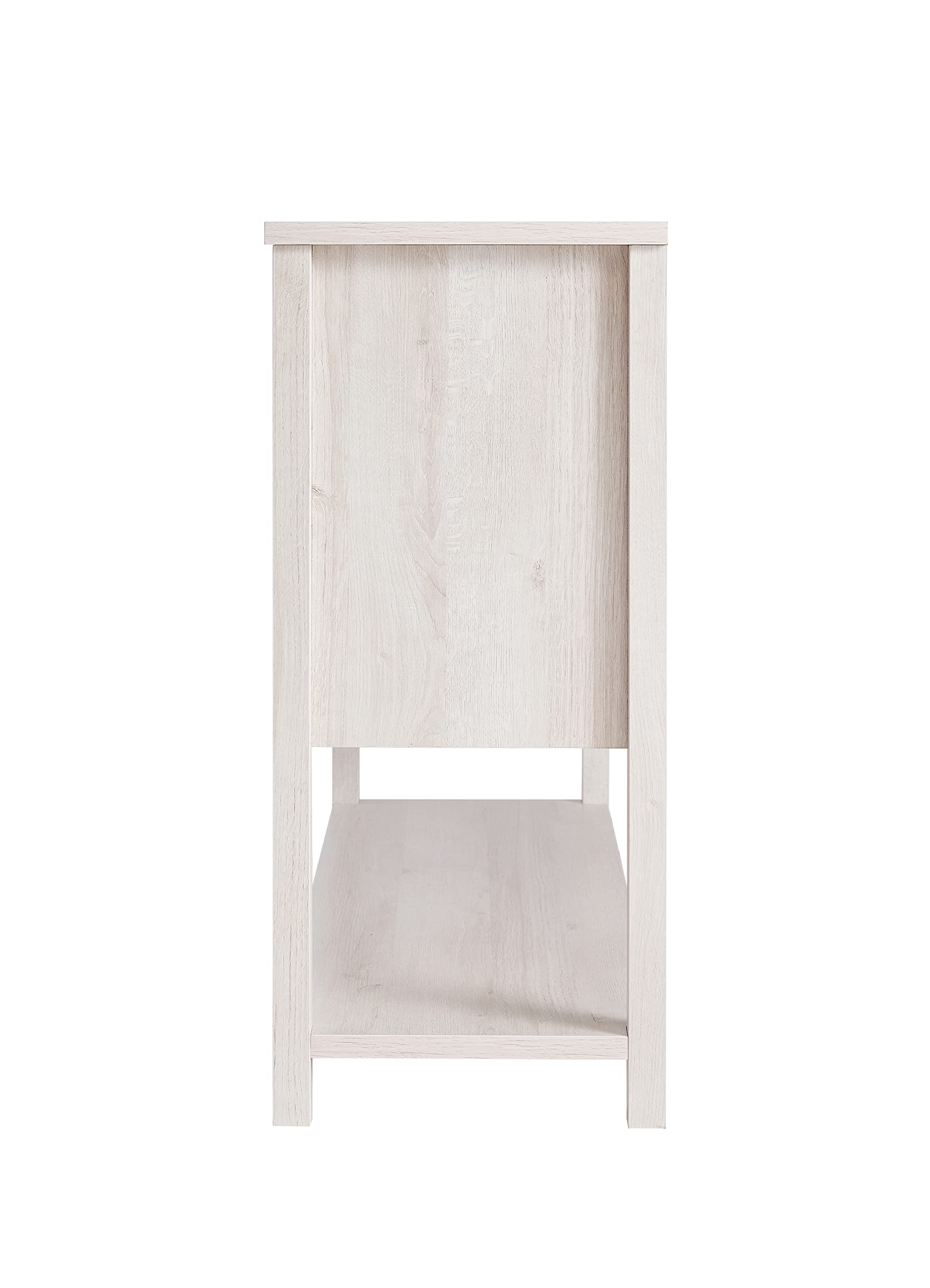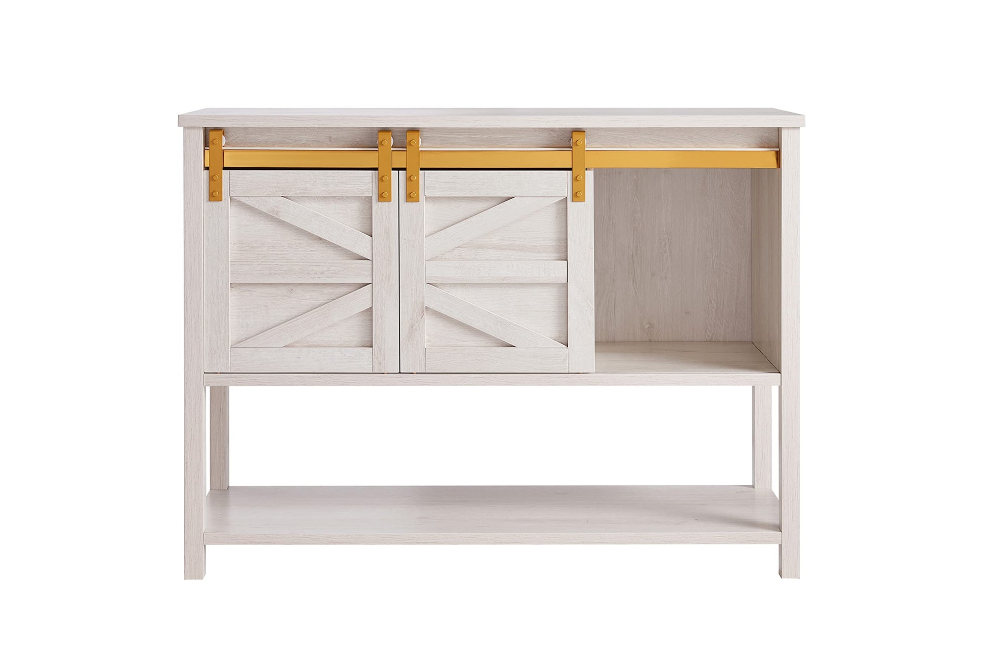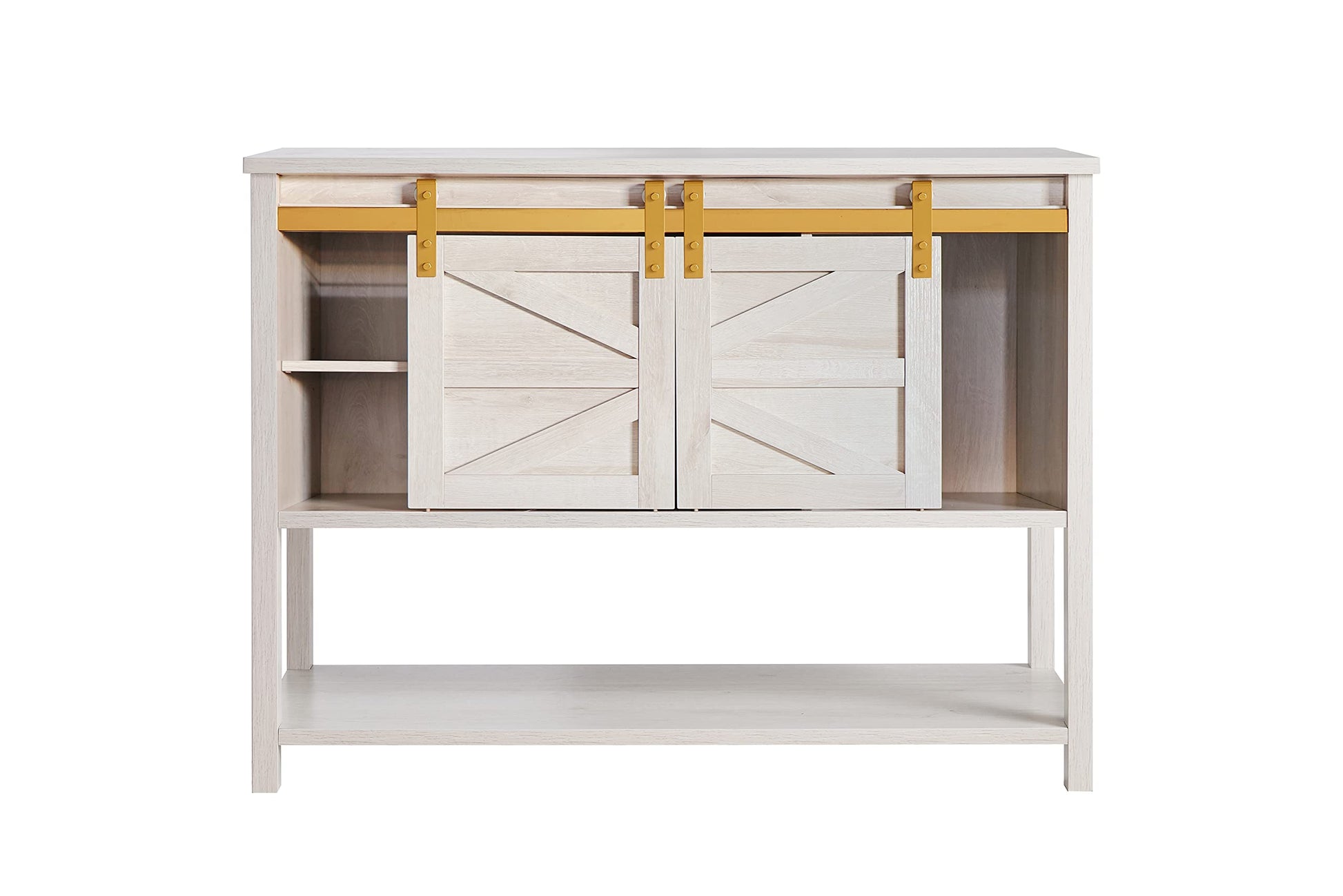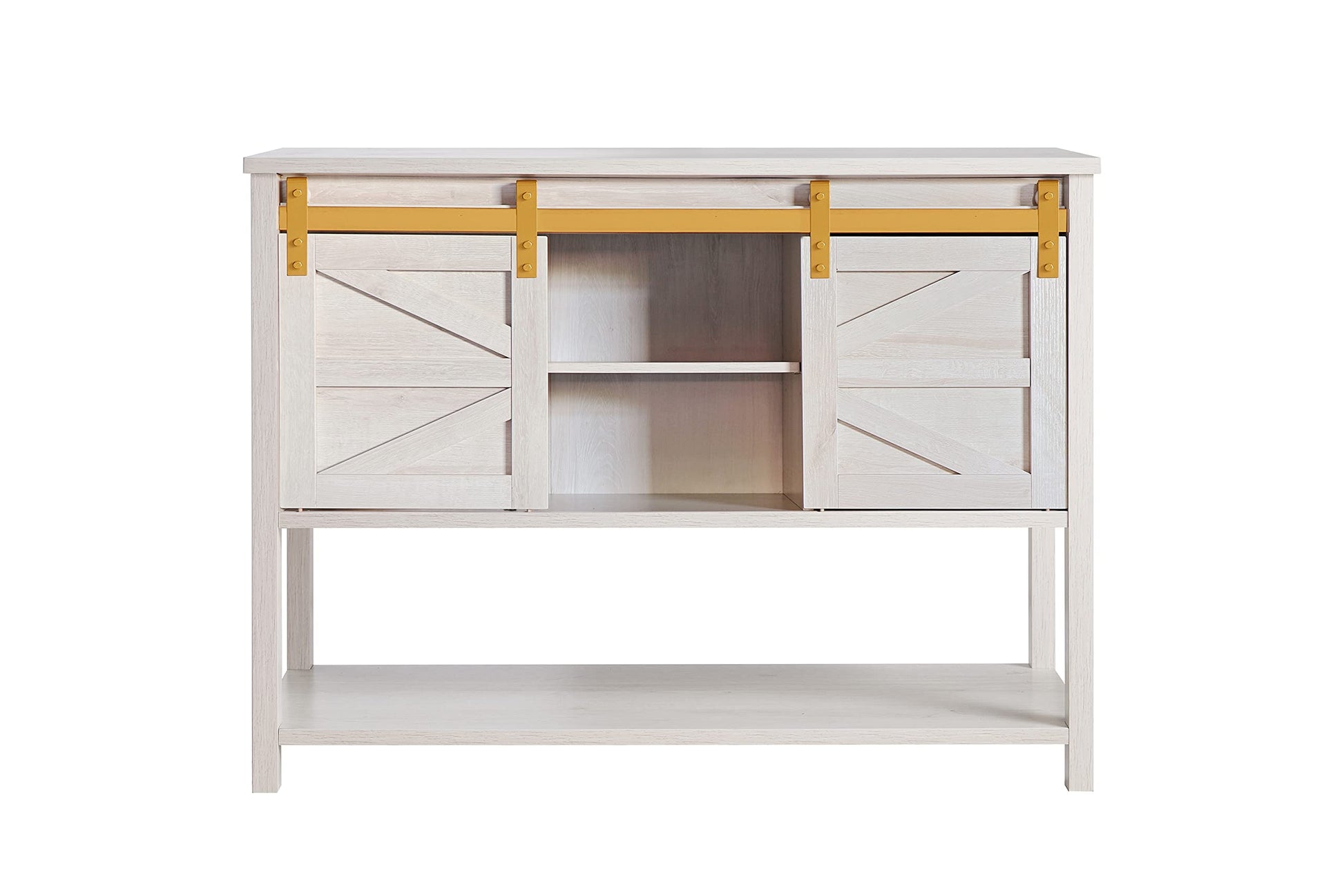 - Farmhouse style; Two sliding cabinet doors to open storage areas with an adjustable shelf
