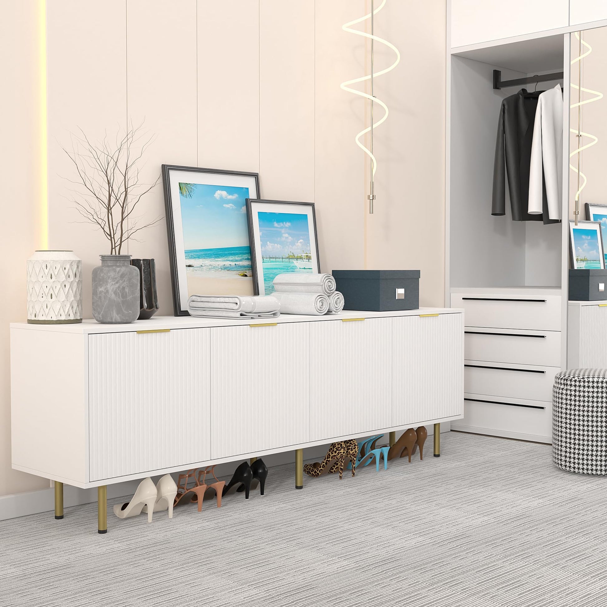 - MINIMALISM & MAGNETS DOORS: The TV stand features a fluted design, the panel is elegant and stylish, and this minimalism style is easy to go with other furniture. The fluted TV stand is equipped with 4 magnets to make it easy and smooth to close the doors. Also, the TV stand comes with 4 metal handles and 6 metal glossy legs to add more warm color to the TV Cabinet