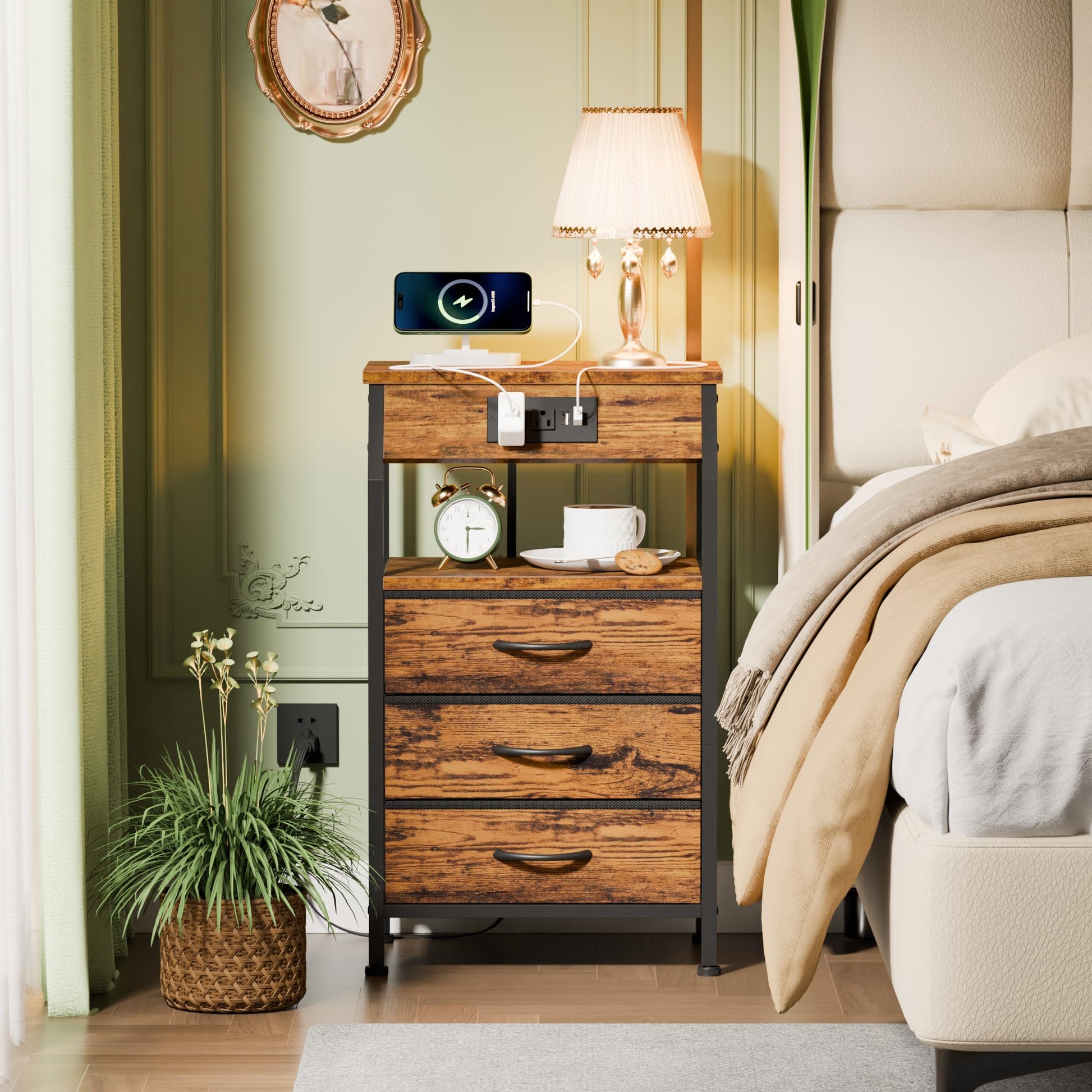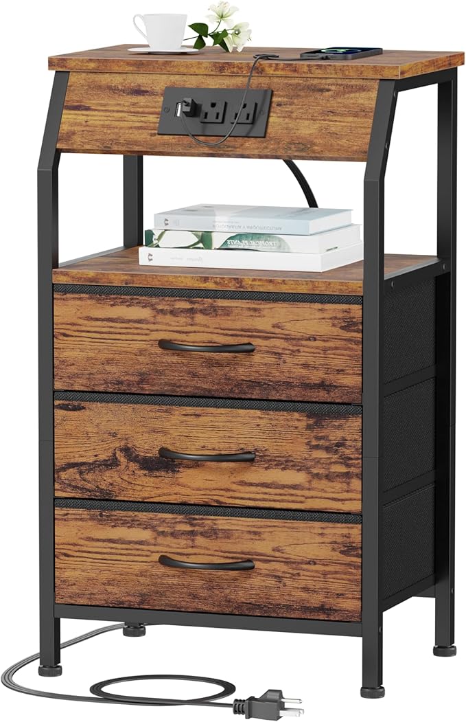 Night Stand with Charging Station, Small Bedside Table with Wood Shelf, End Table