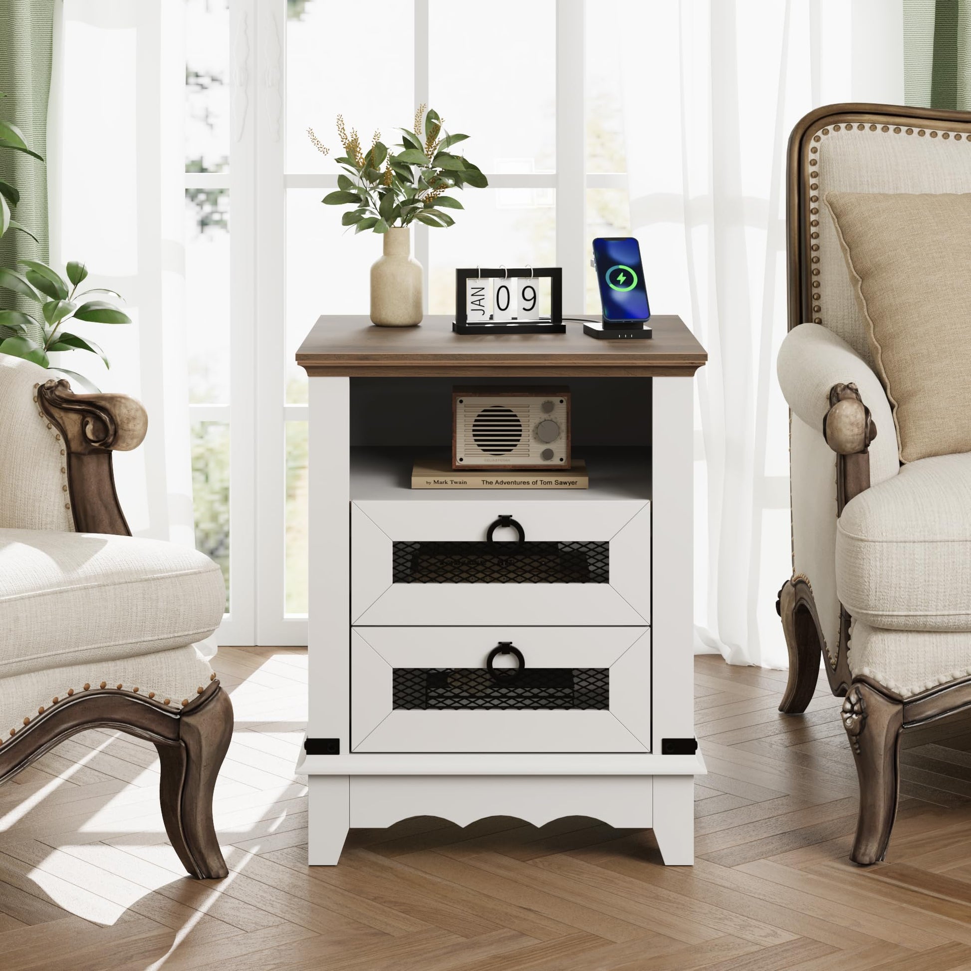 - This farmhouse side table features a charming brown-and-white color combination. The tabletop in brown tones complements the white finish on the rest of the stand, creating a versatile piece that blends well with various furniture styles. The unique wave design at the bottom adds a touch of elegance, while the two drawers with iron mesh detailing elevate the aesthetic appeal. Perfect for seamless integration into your home decor