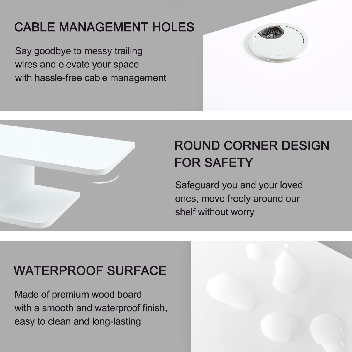 - Wire Management floating tv stand has cable holes designed for hiding messy cables. Keep your stuff neatly organized. The cables will be fixed with the cover to clean the top shelf.