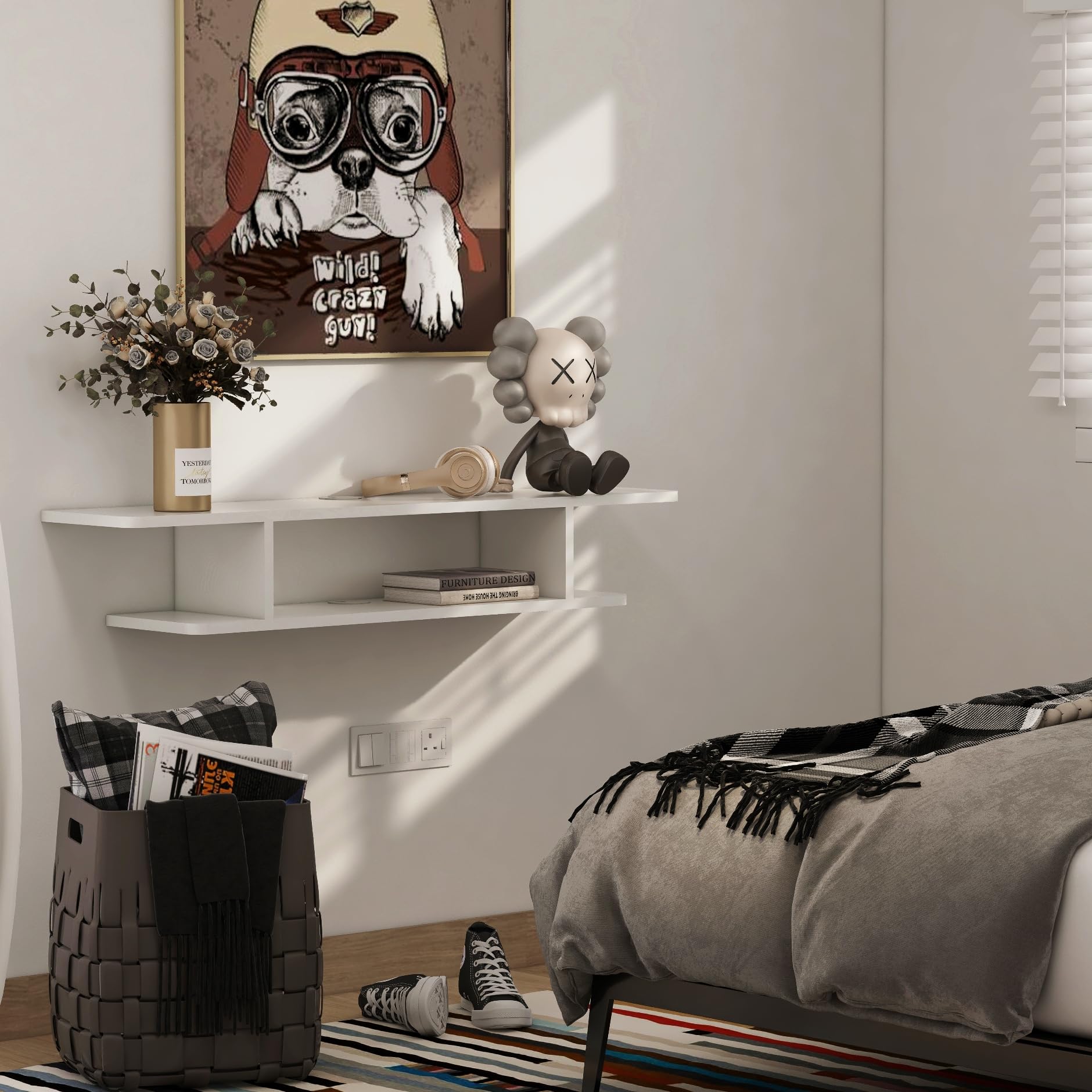 - Space SavingThe elegant design makes this floating TV stand easily fit any style of the room complements other furniture, and frees up valuable floor space. The floating entertainment center media console also features four strong and tested L-shaped metal hanging systems to fix it on the wall. This floating TV console shelf works with drywall, wooden wall, plastered wall, and solid wall (NOT WORK with cavity wall, gypsum board wall).