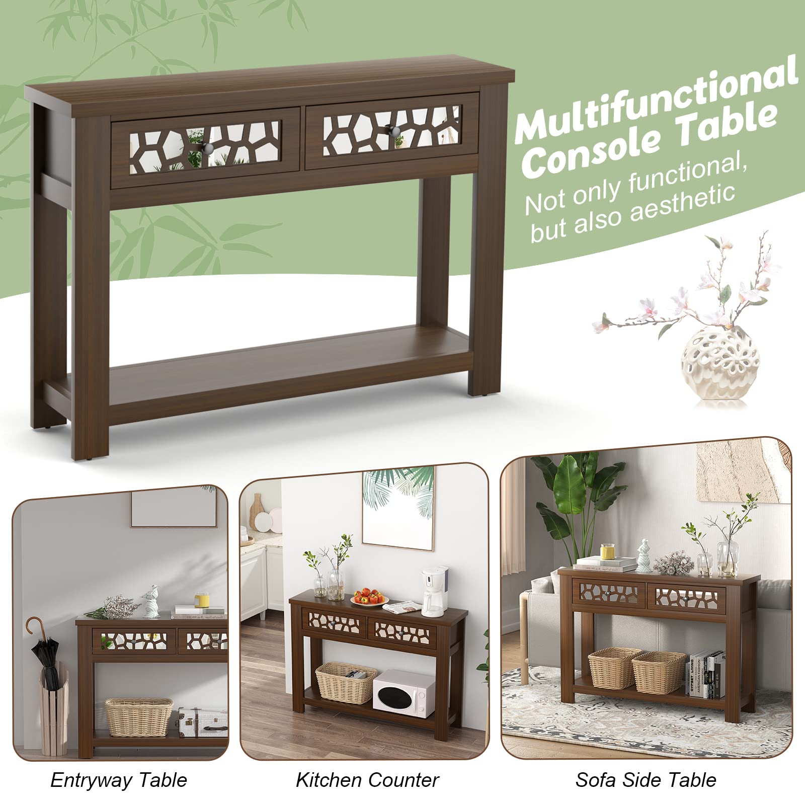 - Spacious Storage Space With a bottom shelf and 2 drawers, this console table will provide you with plenty of storage space. The bottom shelf is great for keeping your books, storage boxes or some potted plants. The table top is great for home decor, while the 2 drawers are convenient for you to store your personal items.