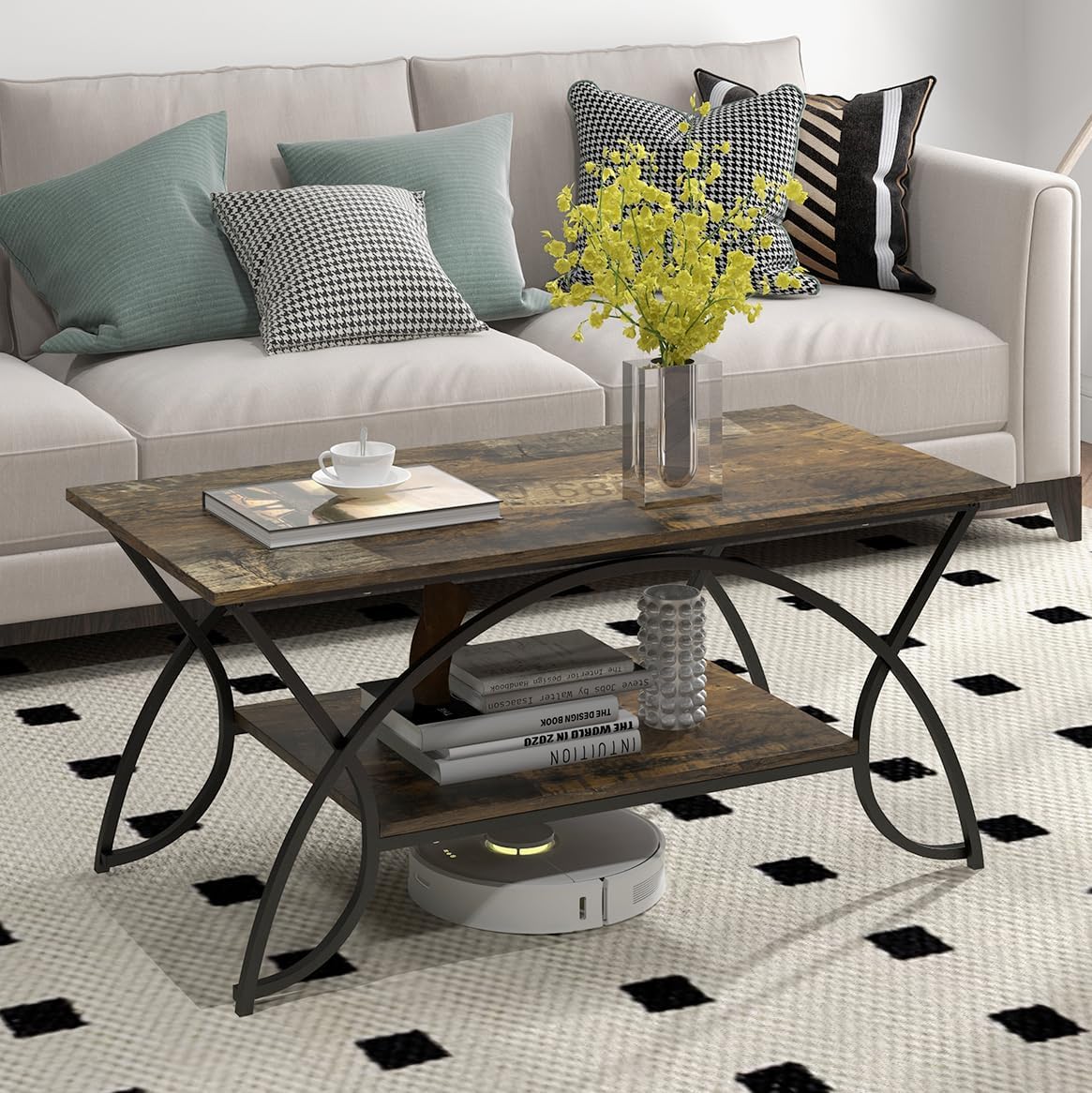 - This rectangular coffee table is equipped with a spacious tabletop and an open shelf at bottom, keeping your various items well organized and easy to access. It offers ample room to store or display a variety of items, like cups, fruit trays, snacks, family photos, remote control, books, decorations and more.