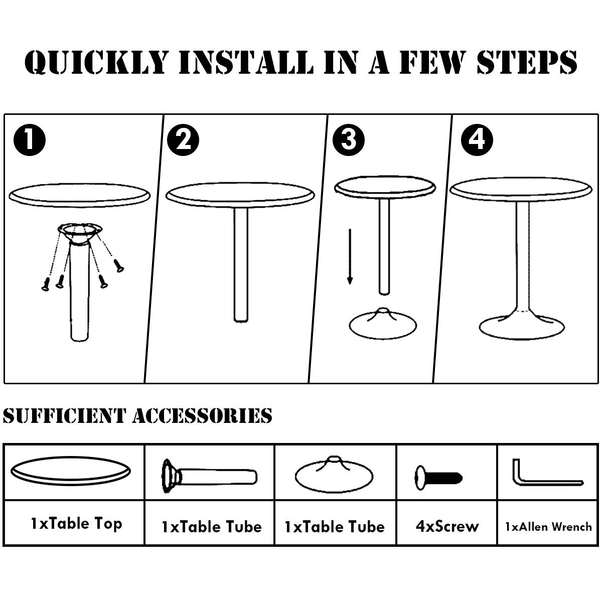 - The table top is made of thickened MDF board and covered with black sticker. The surface is smooth and does not deform, you can easily clean it with a rag. The round shape has no sharp corners to prevent accidental injury or hooking up clothing accessories. It’s perfect for bars, pubs, parties, etc.