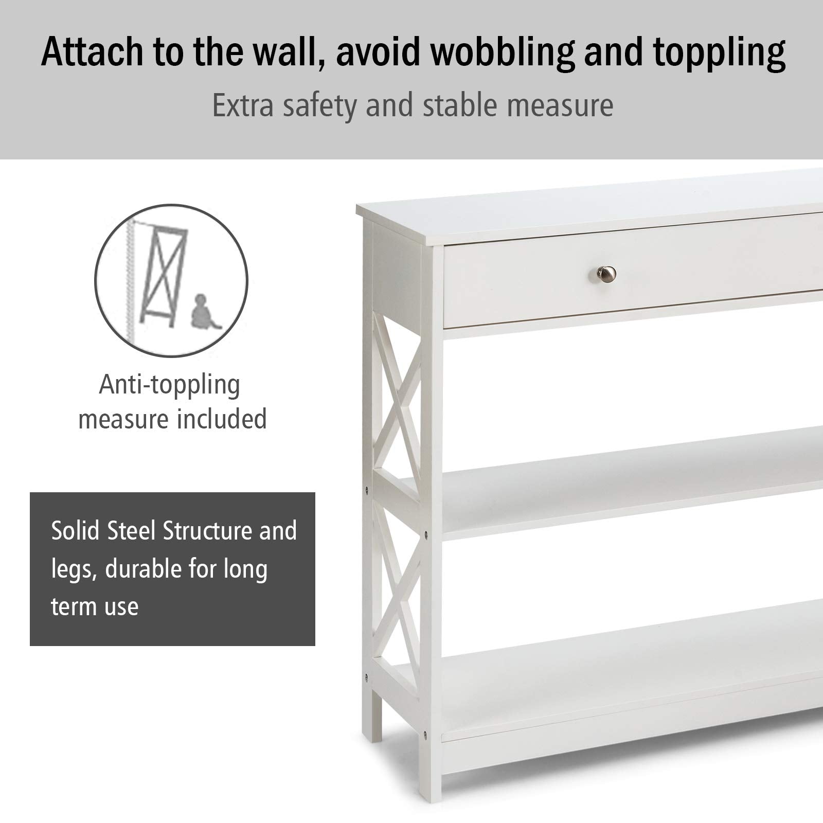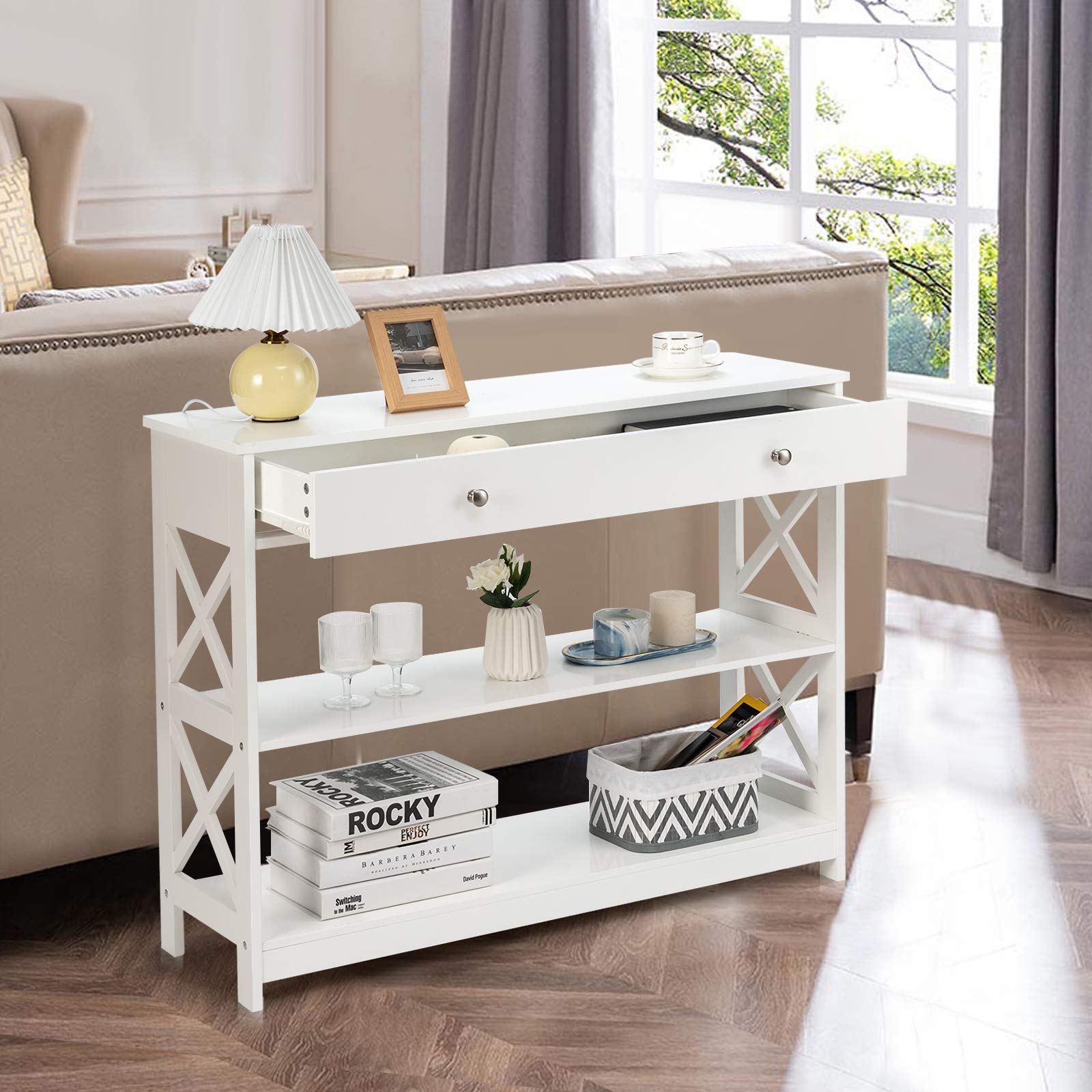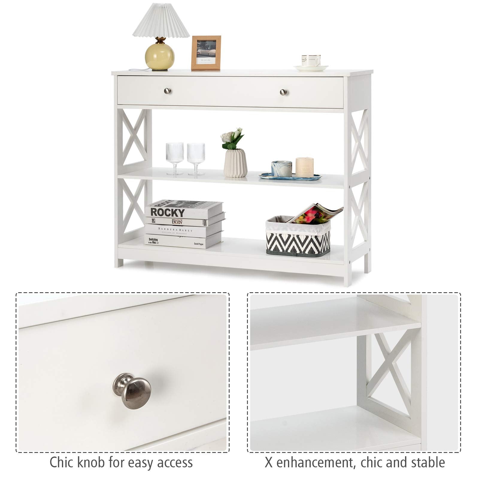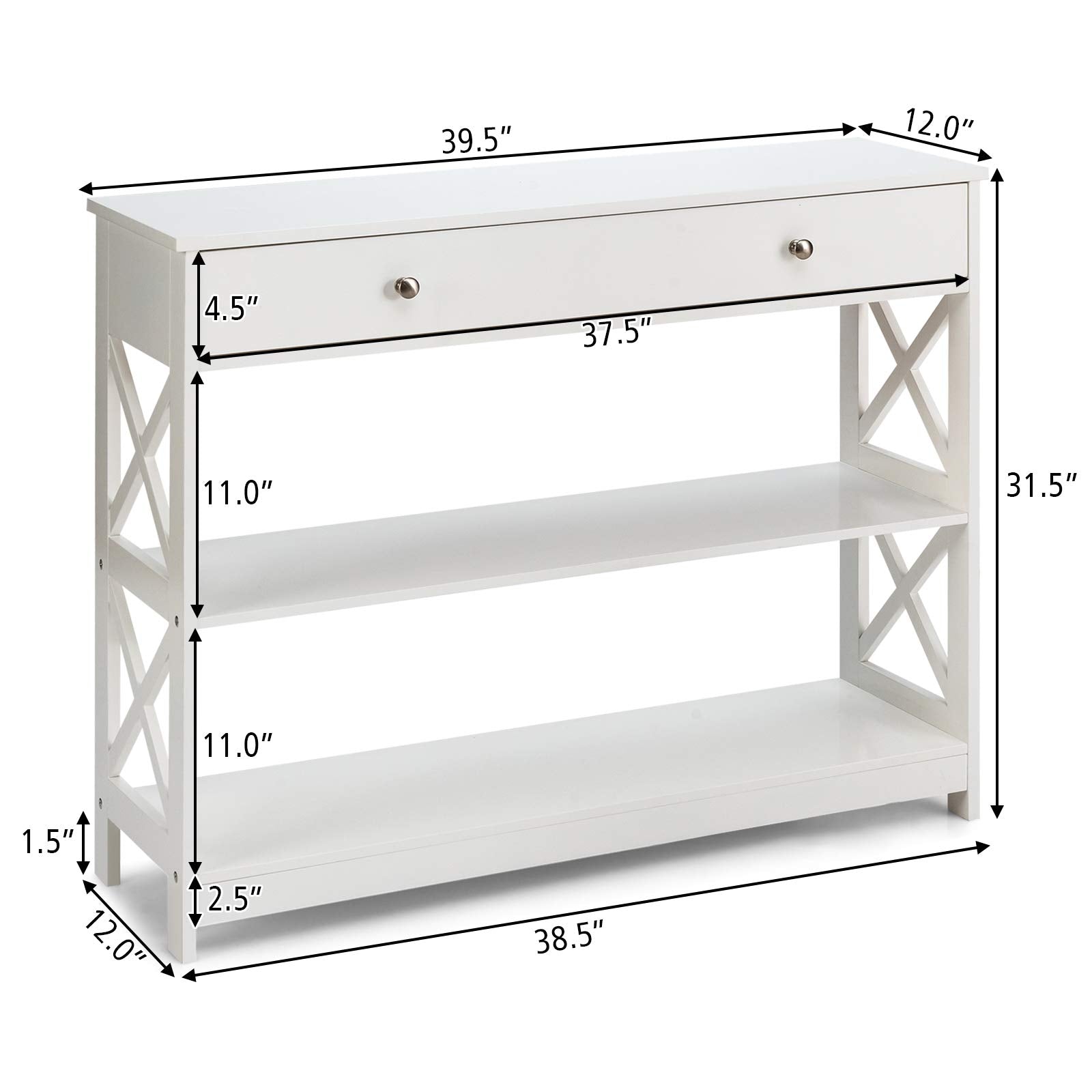 - This side table has an ample drawer with knobs for easy access. It also boasts 2 long shelves and a wide desktop for extra displaying demands. Perfectly arranging your daily essentials with tidiness, this console table is a great addition to your home.
