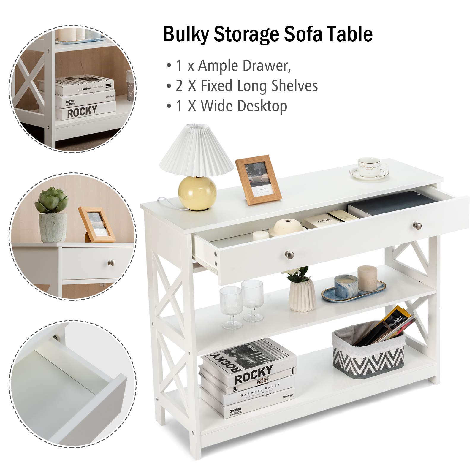 3-Tier Console Table with Drawers, Compact Sofa Table with 2 Shelves and Spacious Desktop,