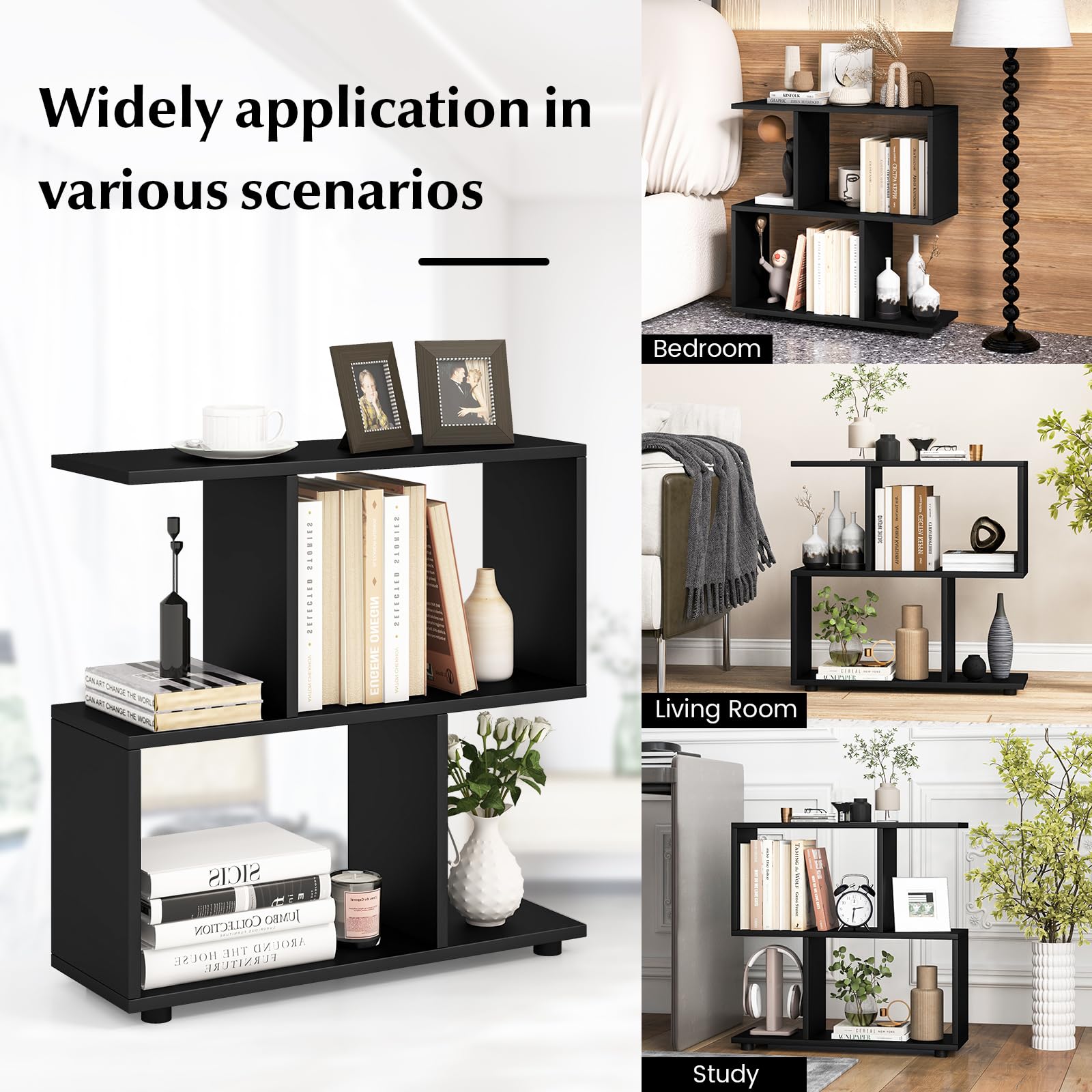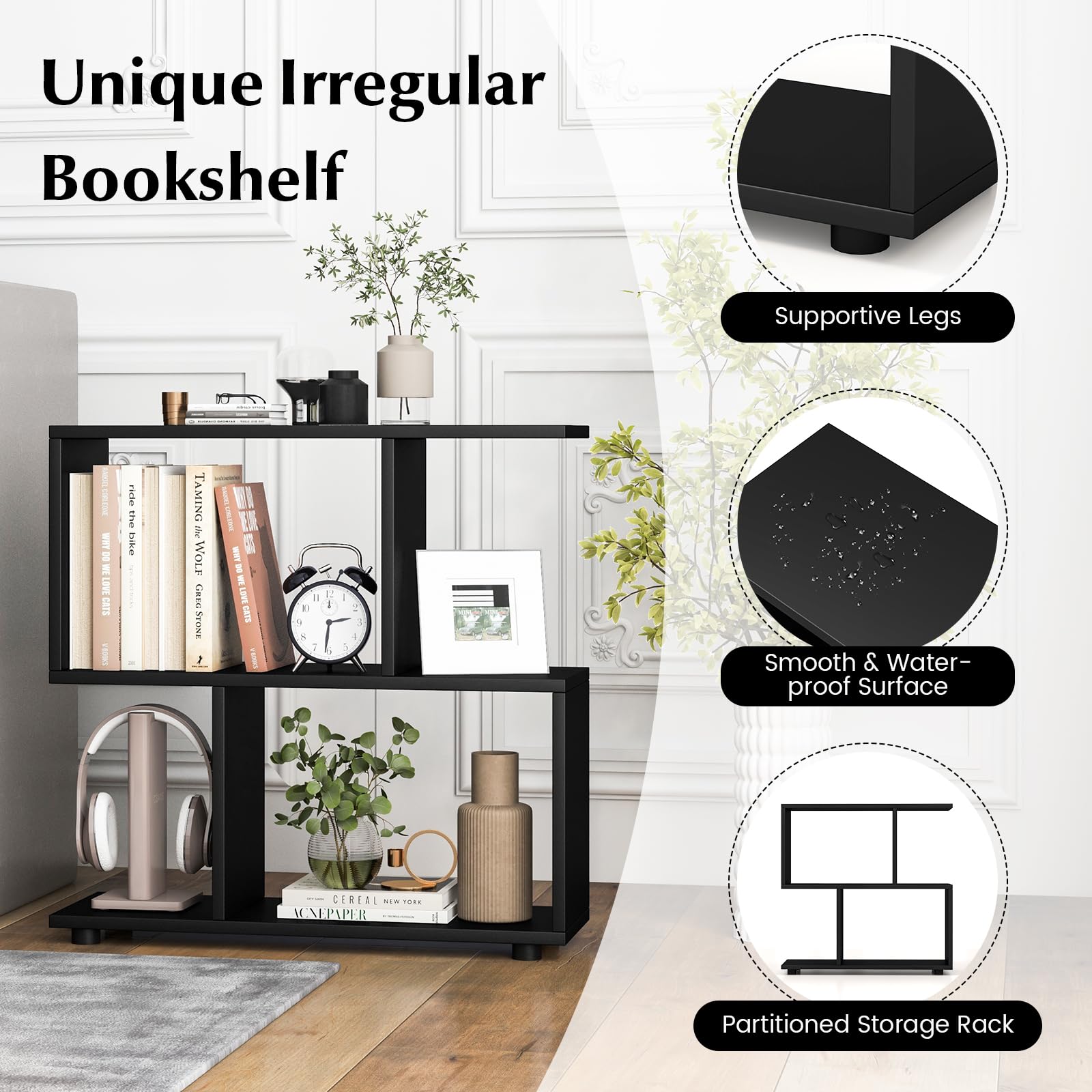 3-Tier Geometric Bookshelf, 24" Tall Wood S-Shaped Display Shelves with Thick Foot Pads, Freestanding Open Shelves Nightstand, Floor Standing Display Shelf Bookcase, Black