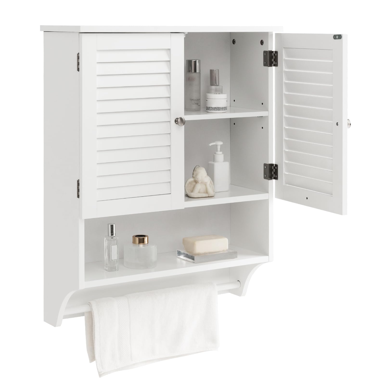- Spacious Storage Space: This wall mounted bathroom cabinet consists of a 2-tier enclosed storage cabinet, an open compartment and a towel bar. As a result, you are able to arrange things in order, including cosmetics, toiletries, towels and 3-level Adjustable Shelf: The bathroom wall cabinet is equipped with an adjustable shelf that can be adjusted to 3 different positions with 1.5” as the increment. Therefore, you can alter the shelf according to varying heights of objects.