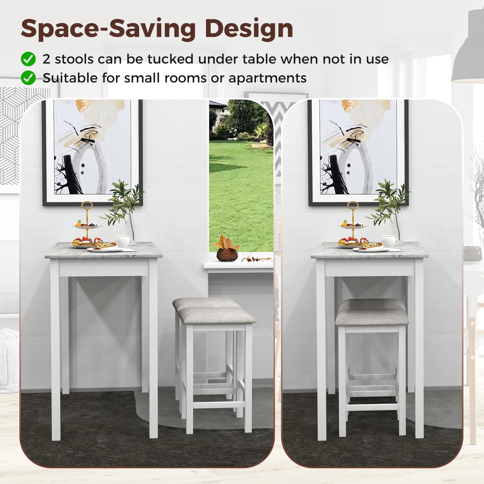 - Measuring 42"x 22"x 36"(L x W x H) for the table and 14"x 14"x 24"(L x W x H) for the stools, this dining table set is designed for compact spaces. When not in use, 2 stools can be conveniently tucked under the table, making it perfect for small rooms and apartments.
