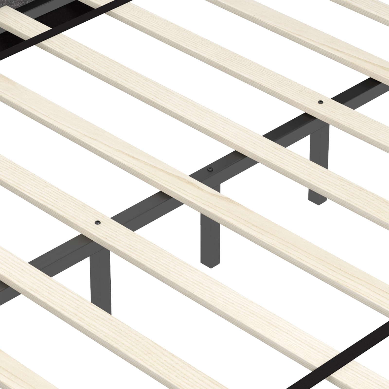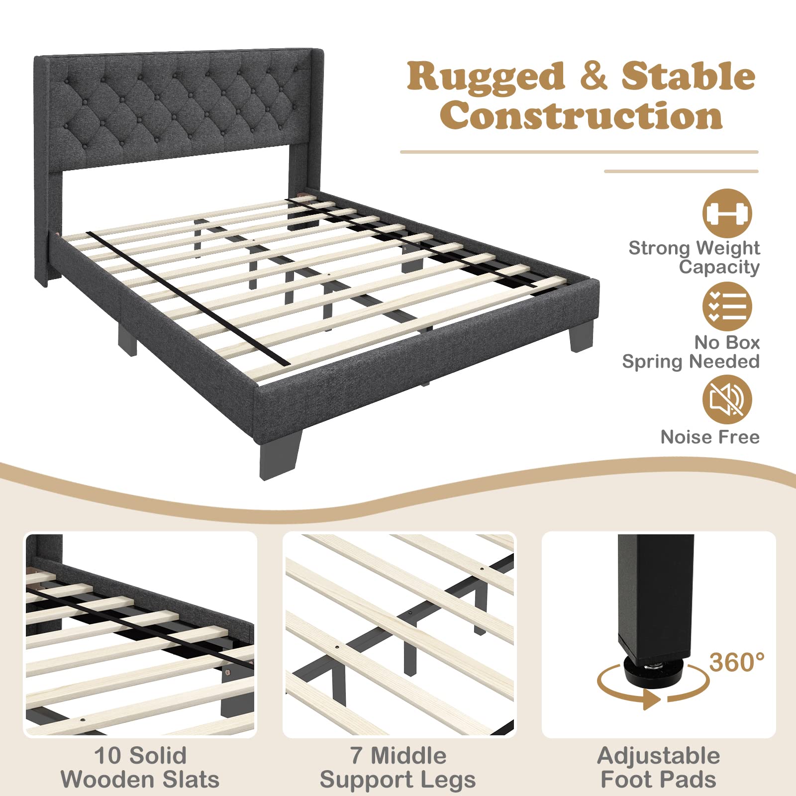 - Reliable and closely spaced wood slats of bed frame are designed to support your mattress without a box spring. In addition, anti-slip pads can eliminate the noise from ground, giving you a quiet and comfortable resting environment.