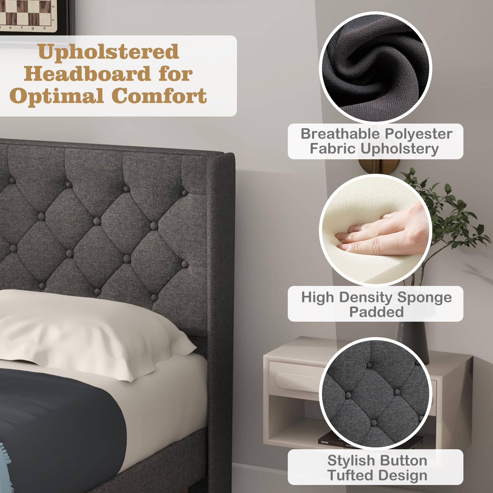 - [Upholstered Headboard for Comfort]: The upholstered headboard is filled with high density sponge, providing good softness to support your body to lean on it with relaxation. Together with breathable polyester fabric upholstery, the headboard adds more comfort.