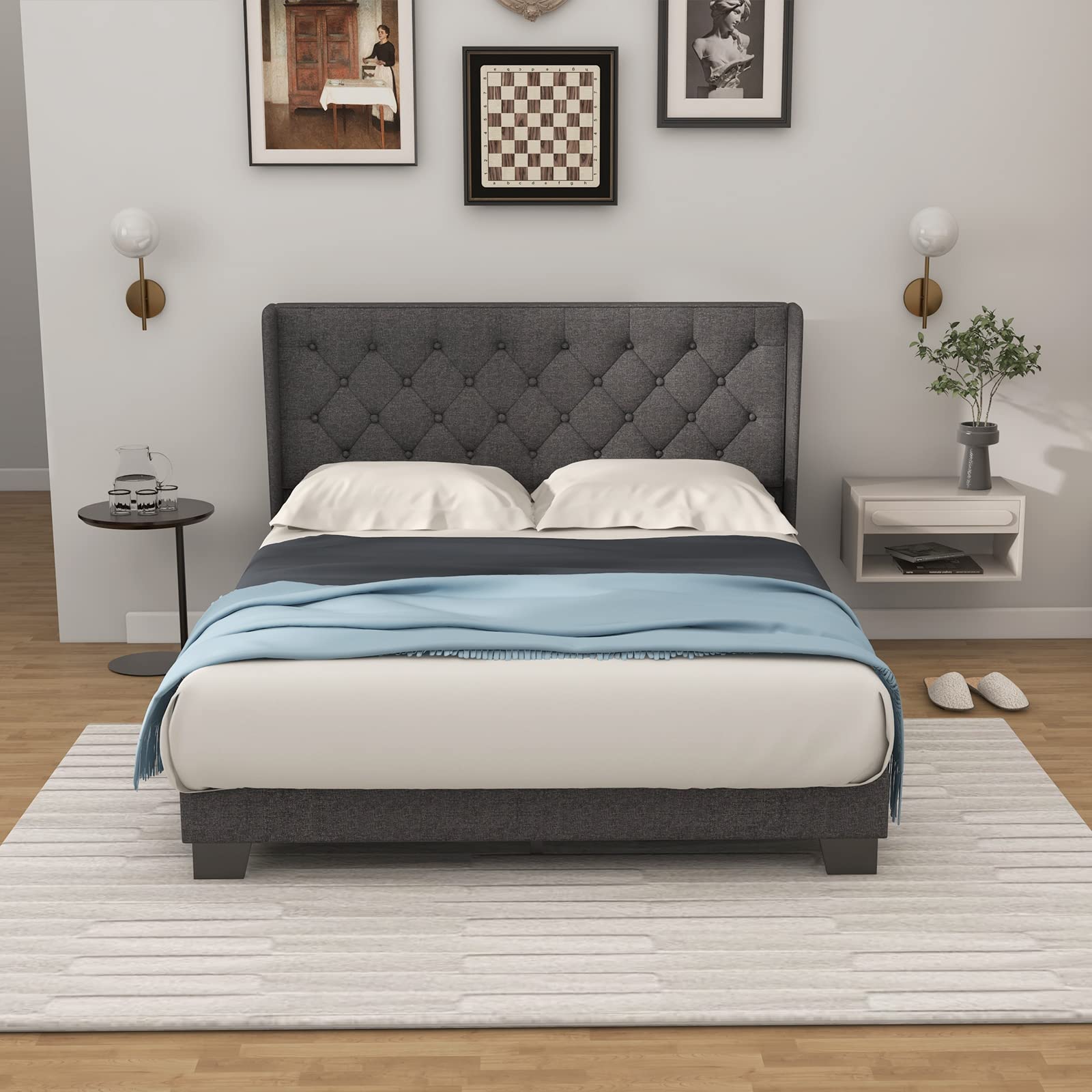 Full Bed Frame with Button Tufted Headboard, Modern Fabric Upholstered Platform Bed