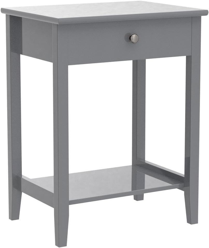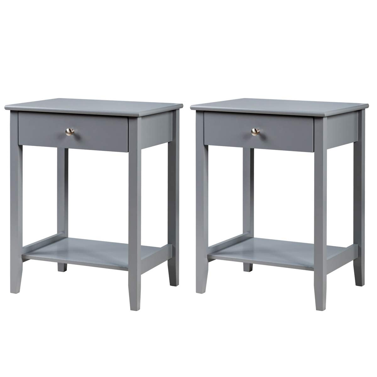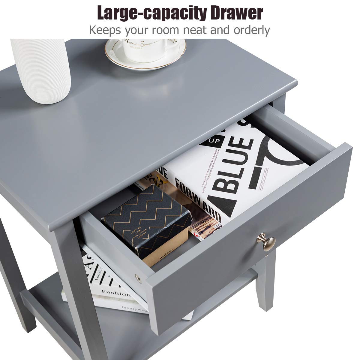 - Including 1 drawer with a metal handle and 1 lower storage shelf, this 2-tier nightstand is perfect for storing bedside essentials and sundries. Spacious table top allows you to place cups, glasses, family photos, lamps and more. Plus, the drawer is designed for stashing your private items in order.