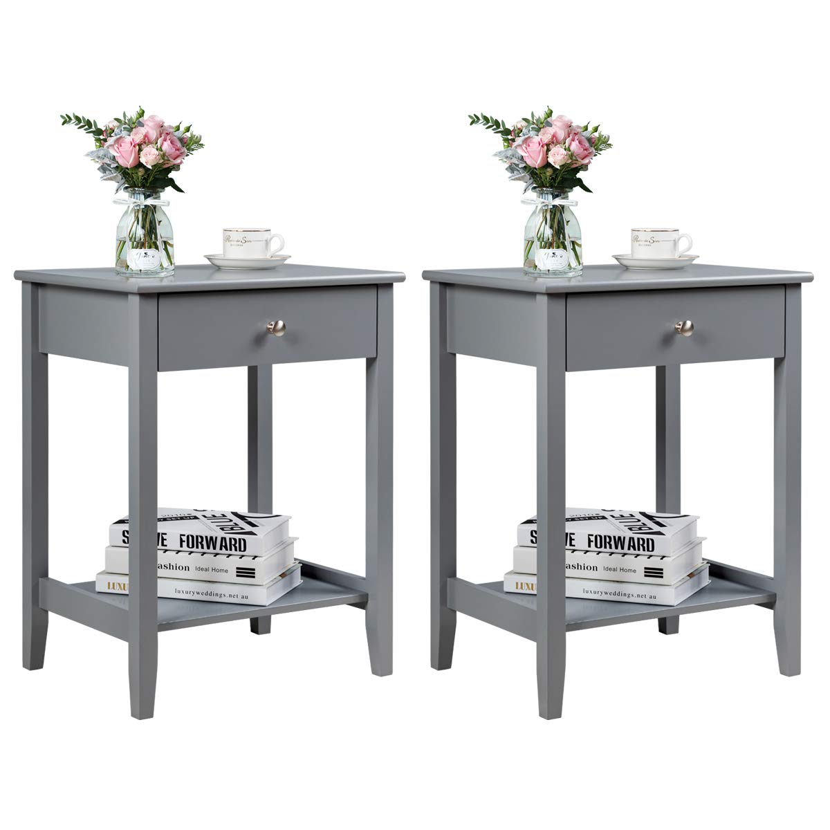 Nightstand Wooden 2-Tier Couch Sofa Side Table with Drawer, Storage Shelf