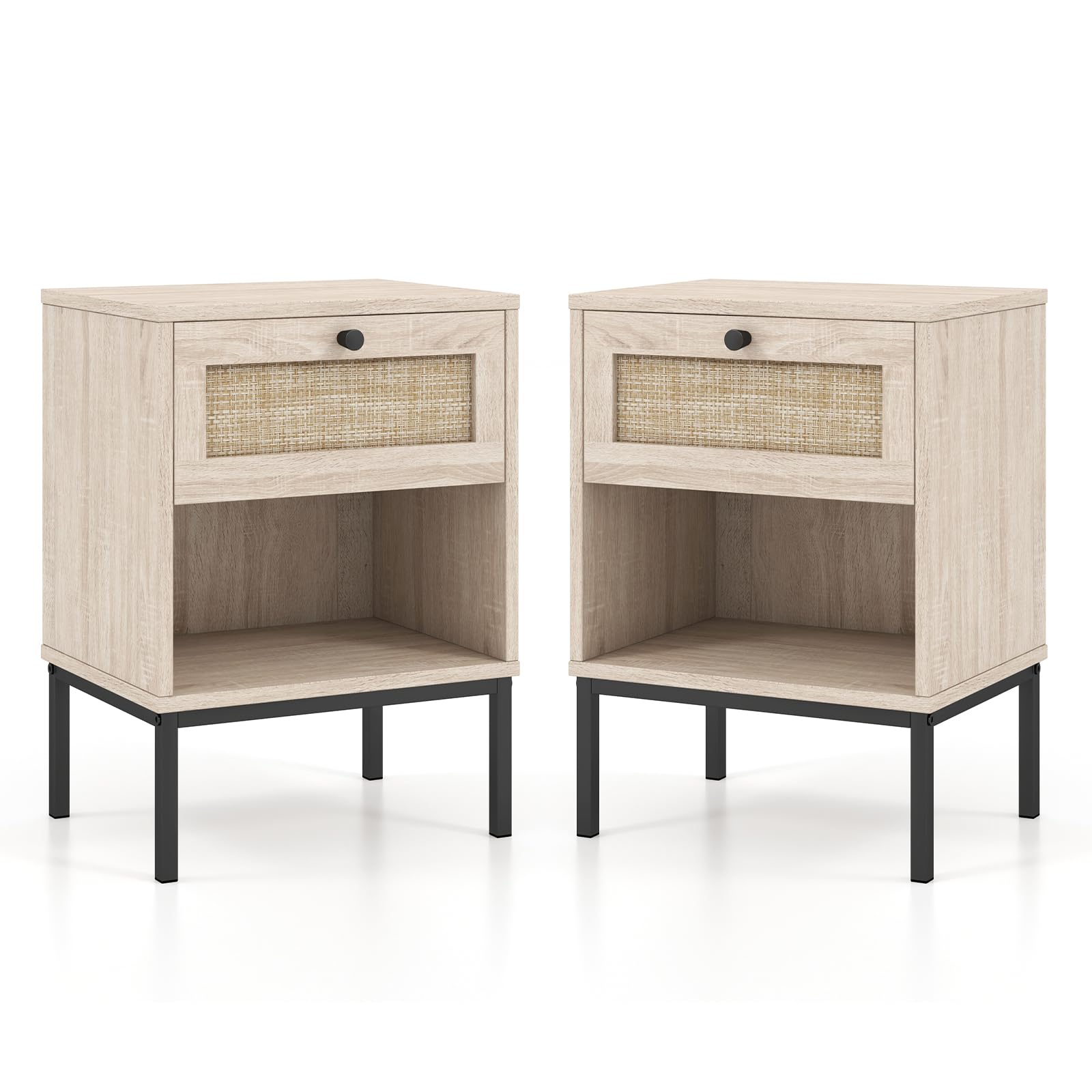 Rattan Nightstands with Drawer Set of 2, Boho Side Tables with 4 Metal Legs and Open