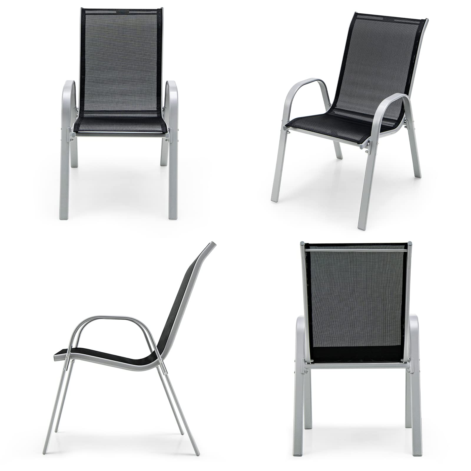 - [Stackable Outdoor & Indoor Chairs]: These 4 patio dining chairs have a simple design and comfortable seat, making them perfect for relaxing outdoors. They can be used in various settings such as by the pool, in the backyard, or in the garden. When not in use, the chairs can be stacked together for easy storage.