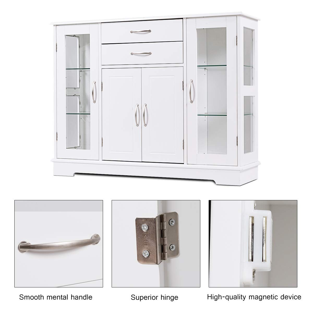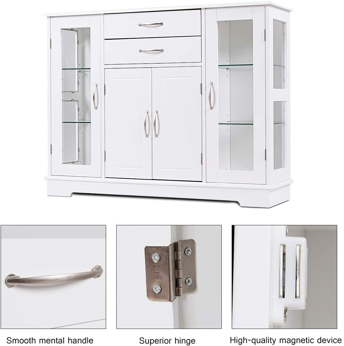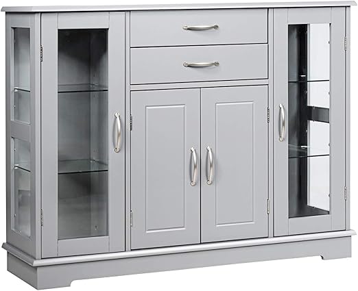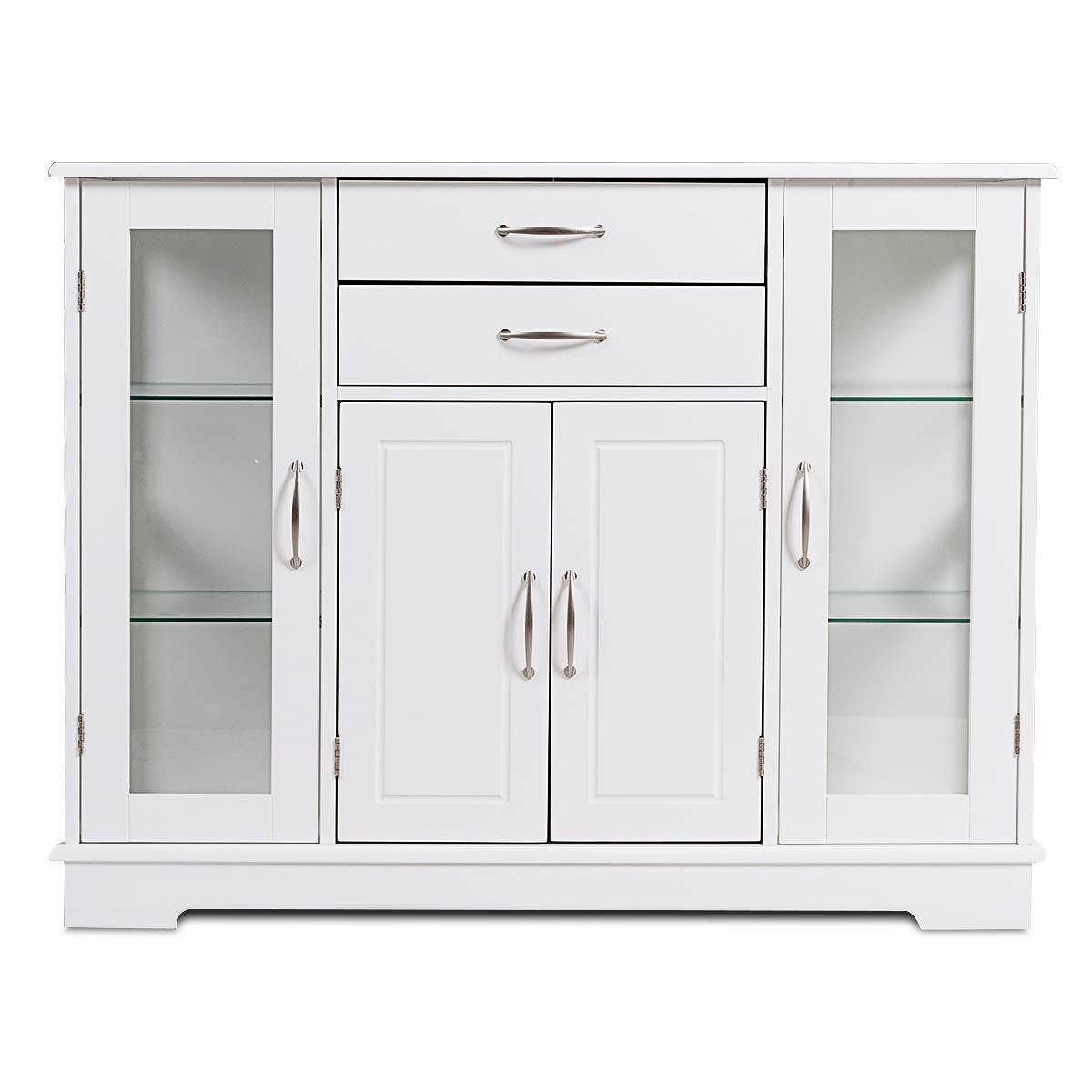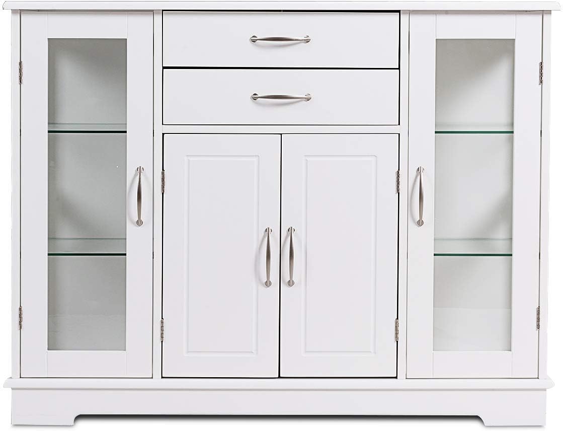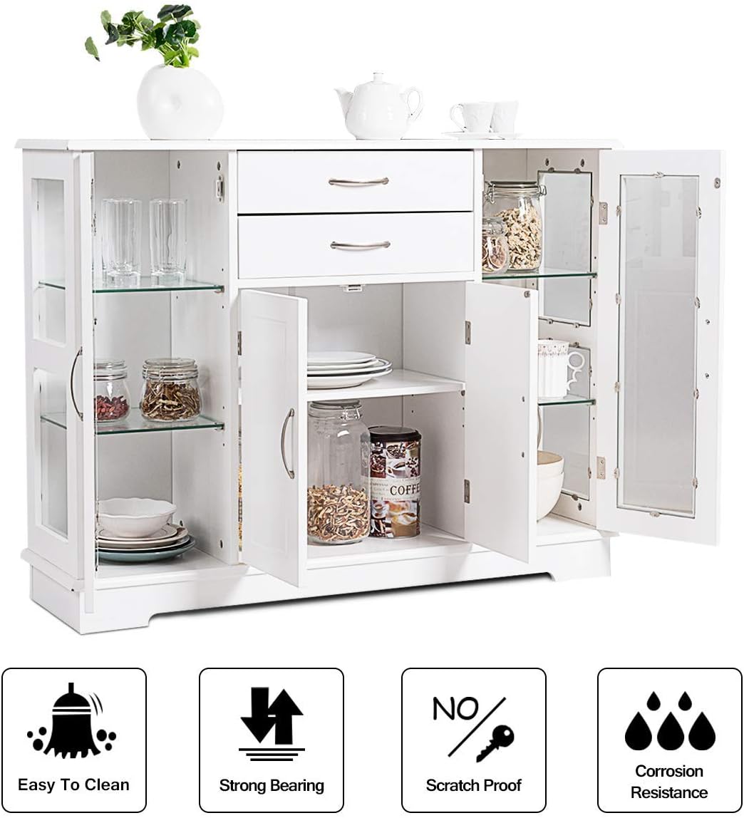 - This simple but practical buffet is a perfect to fit your kitchen or dining room and provides you with a unmatched convenience. Create your own casual yet sophisticated storage, enjoy extra storage in your kitchen with this cabinet. Featuring 2 drawers, 4 tempered glass shelves behind the tempered doors and one adjustable shelf behind the double door, this buffet provide enough storage space for you and waterproof material for long time and durable usage.
