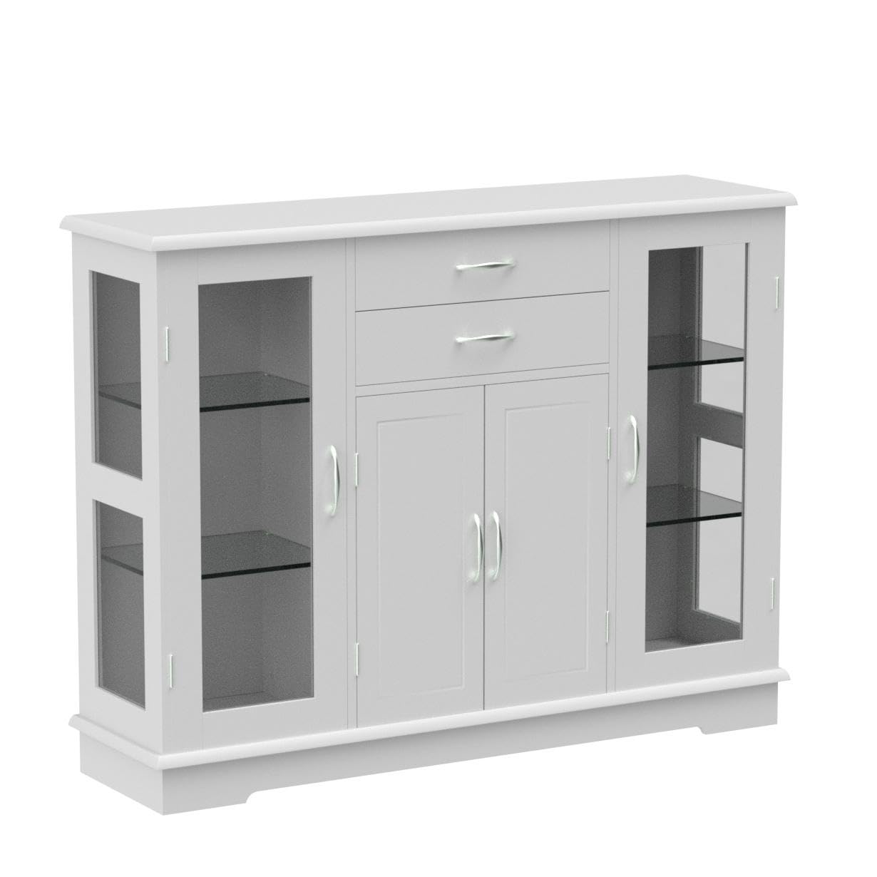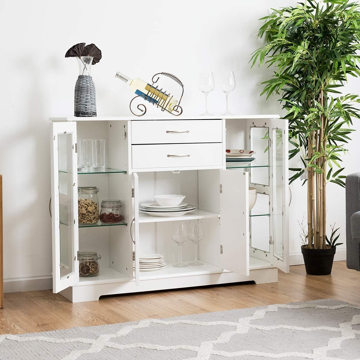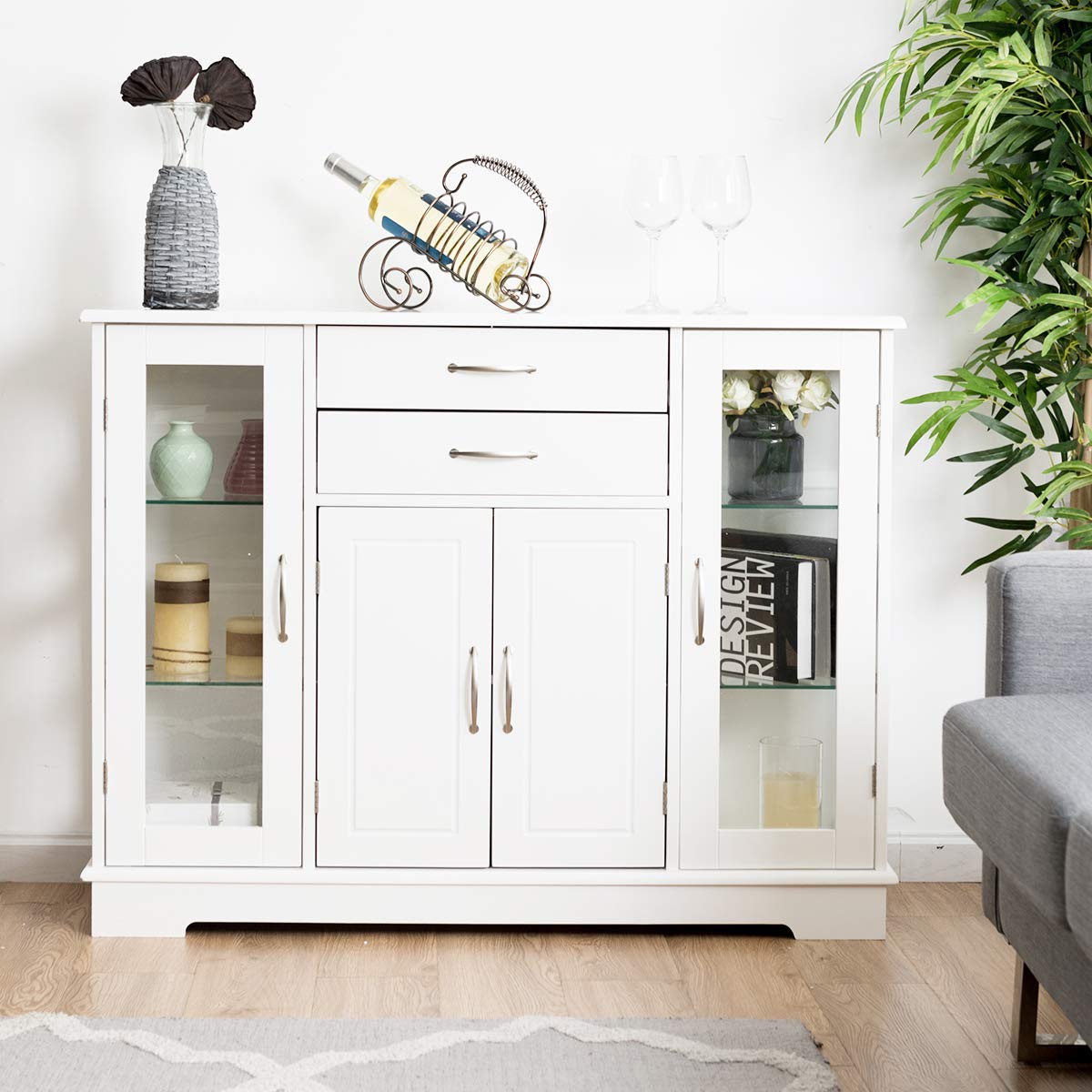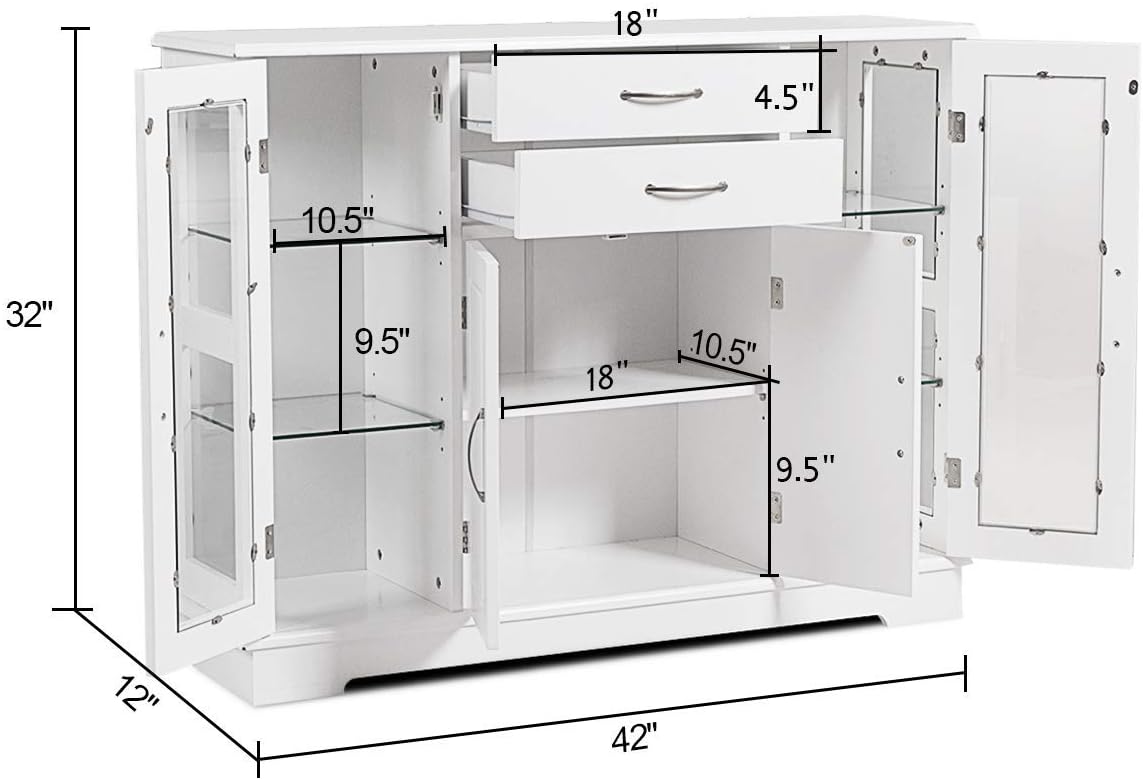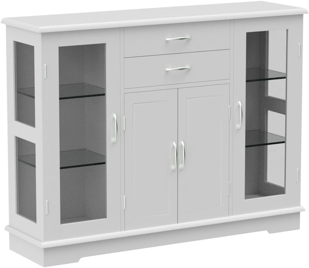 - This simple but practical buffet is a perfect to fit your kitchen or dining room and provides you with a unmatched convenience. Create your own casual yet sophisticated storage, enjoy extra storage in your kitchen with this cabinet. Featuring 2 drawers, 4 tempered glass shelves behind the tempered doors and one adjustable shelf behind the double door, this buffet provide enough storage space for you and waterproof material for long time and durable usage.