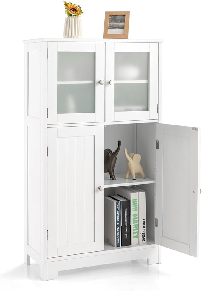 - 5 Storage Compartments & Adjustable Shelf: Equipped with a spacious top, an upper cabinet with 3 fixed compartments and a lower cabinet with a 3-position adjustable shelf, this 4-door floor storage organizer can keep all your items well organized, such as bathroom essentials, kitchen utensils, books, decorations and more.