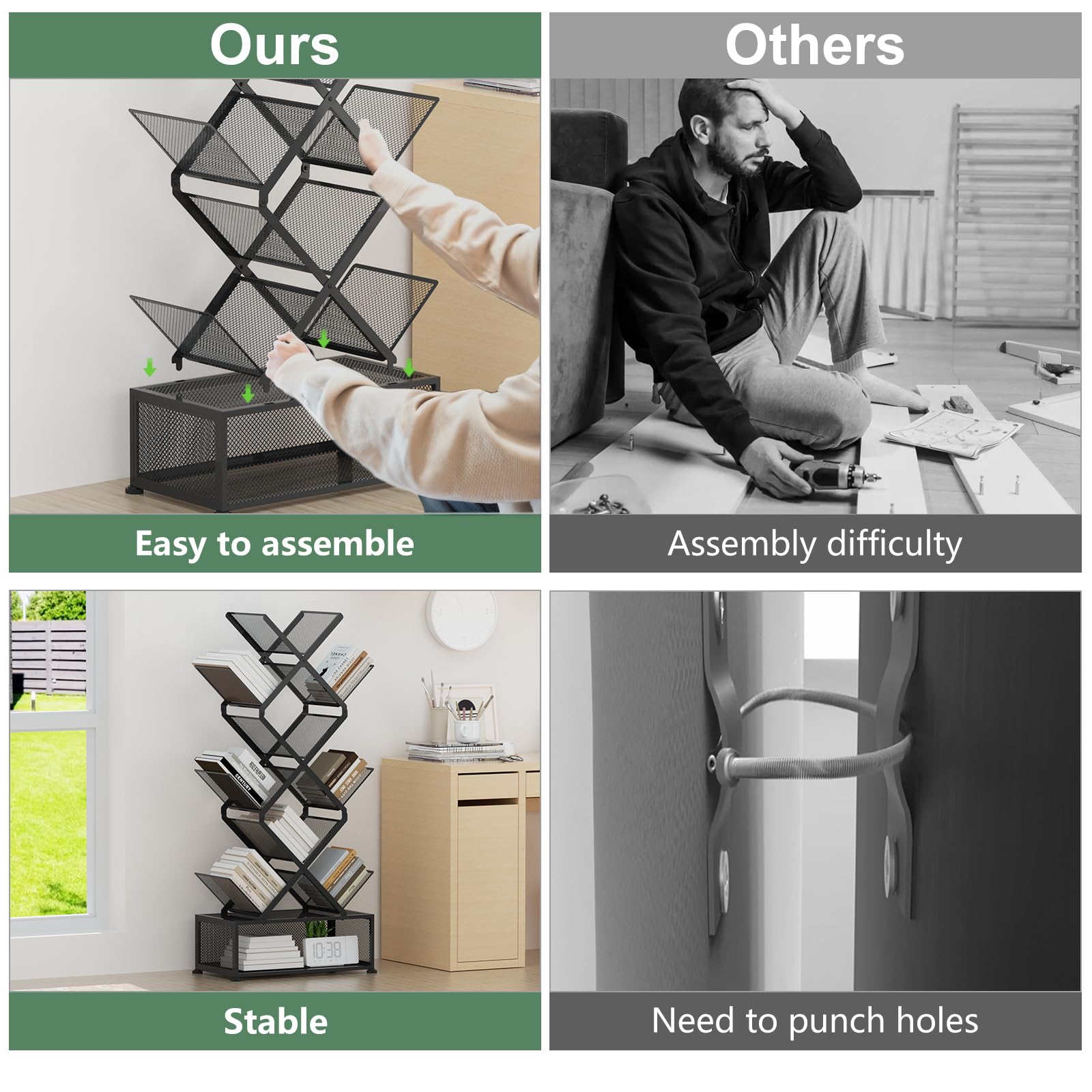- Modern Design: It adopts a unique tree structure, the multifunctional partition design of the book case is perfect for displaying your books, CDs, magazines, video games, manga, decorations, novels, speakers and more. This storage rack is applied to any style of home decor