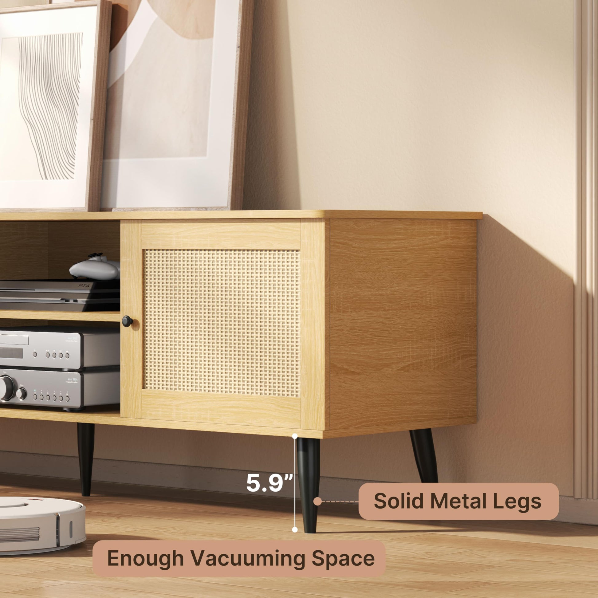 - Charming TV companion This TV stand features charming rattan decorative doors that beautifully complement the natural wood tone, resulting in a seamless fusion of modern and bohemian styles. Whether you choose to place it in your bedroom, living room or entryway, it will bring you a surprising aesthetic enjoyment.