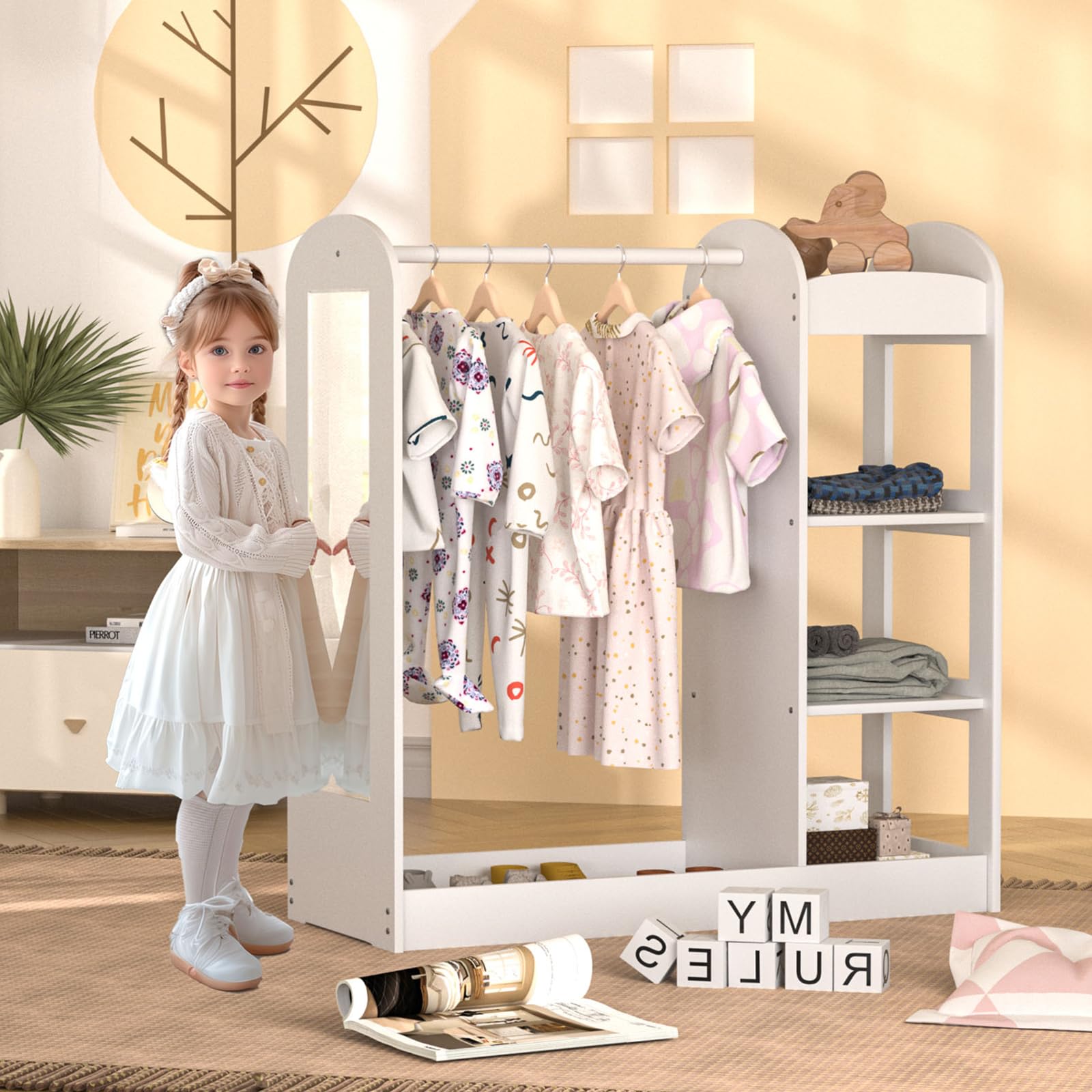 - Glaf open kids wardrobe has a huge storage space including 4 open shelves, 1 wooden hanging bar and 3 extra hanging brackets, accommodating a wide range of items such as clothes, shoes, toys, books, and decorations, which will satisfy your daily organisation and storage. Also, there is a full-length acrylic mirror on one side that won't accidentally break, so kids can safely enjoy their daily outfits.