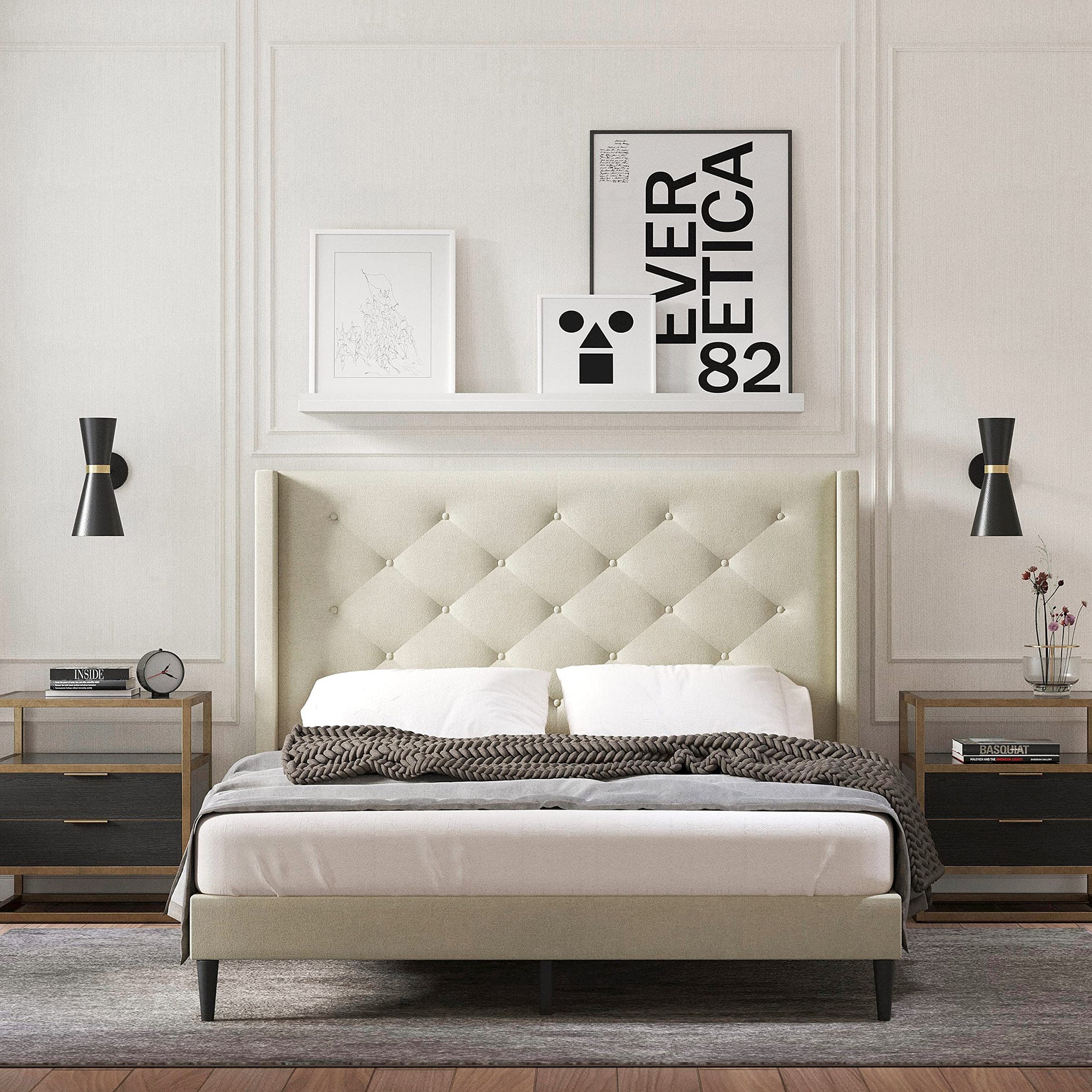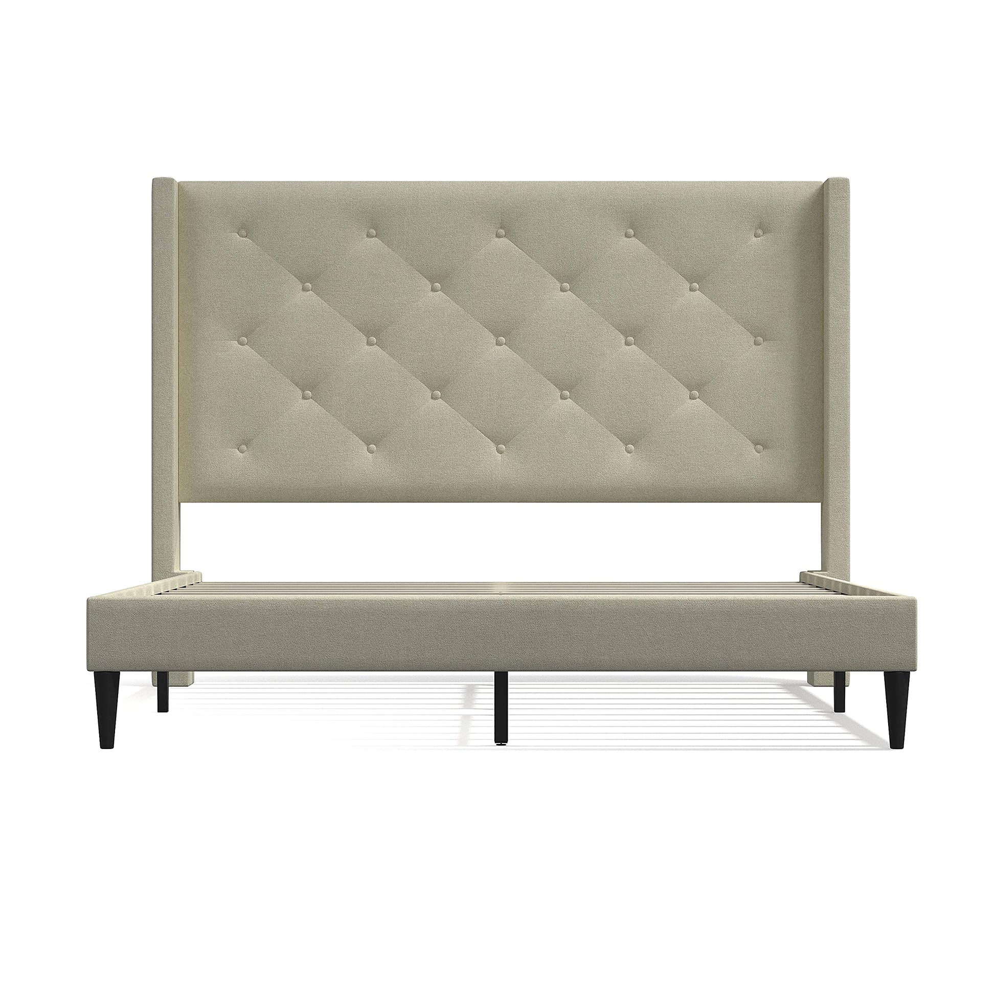 Huppe Upholstered Platform Bed Frame/Button Tufted MCM Wingback/Mattress