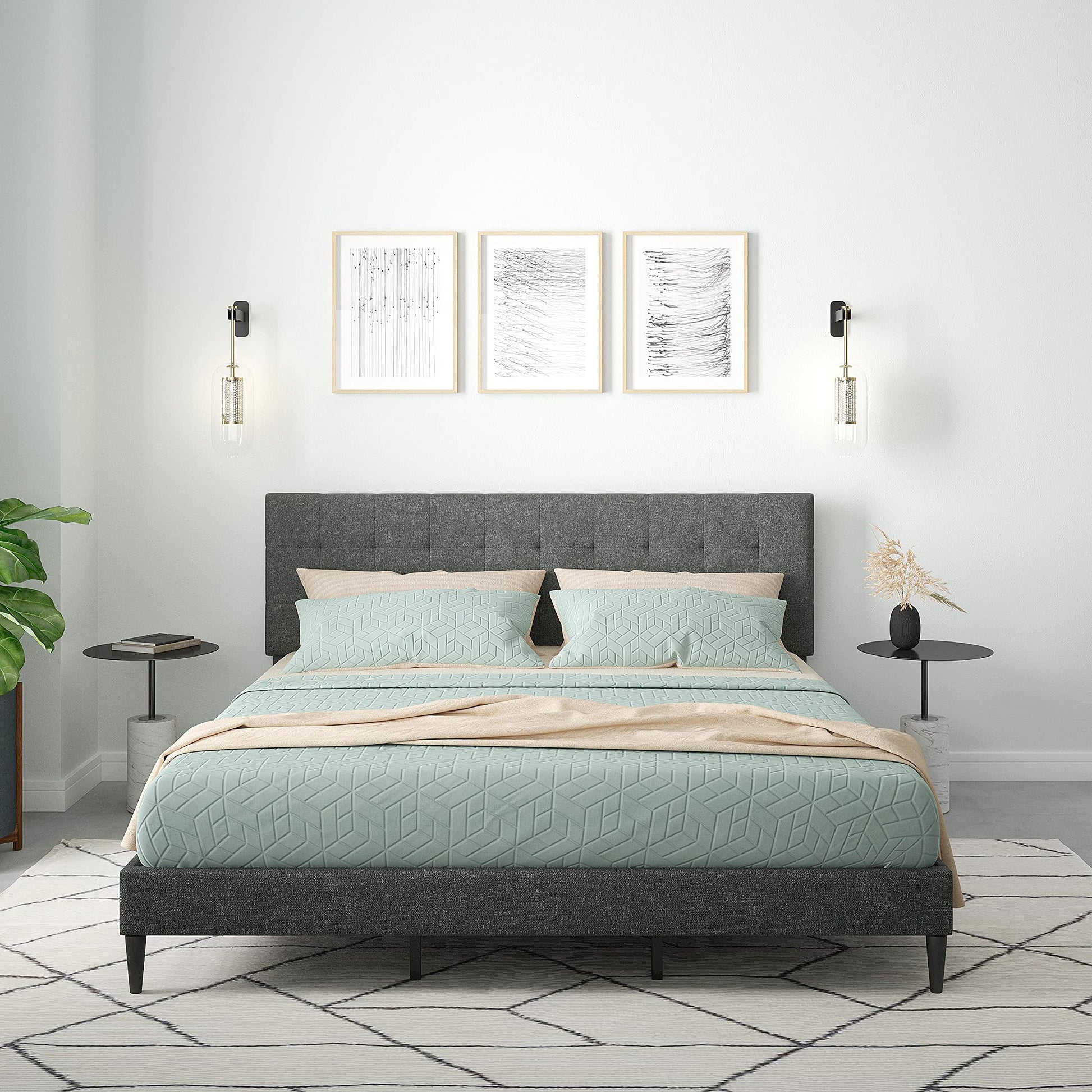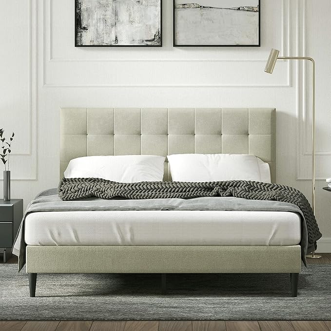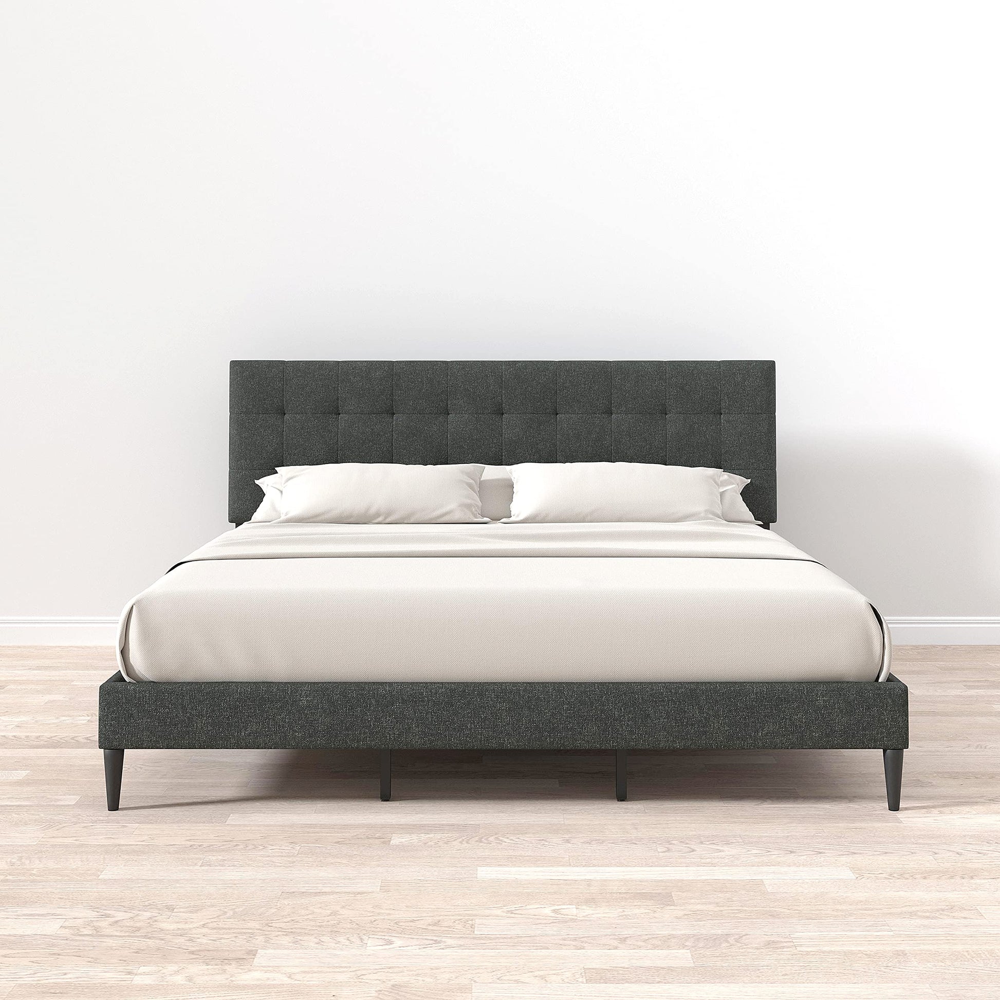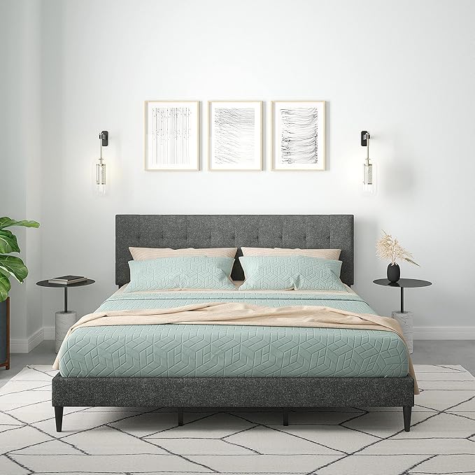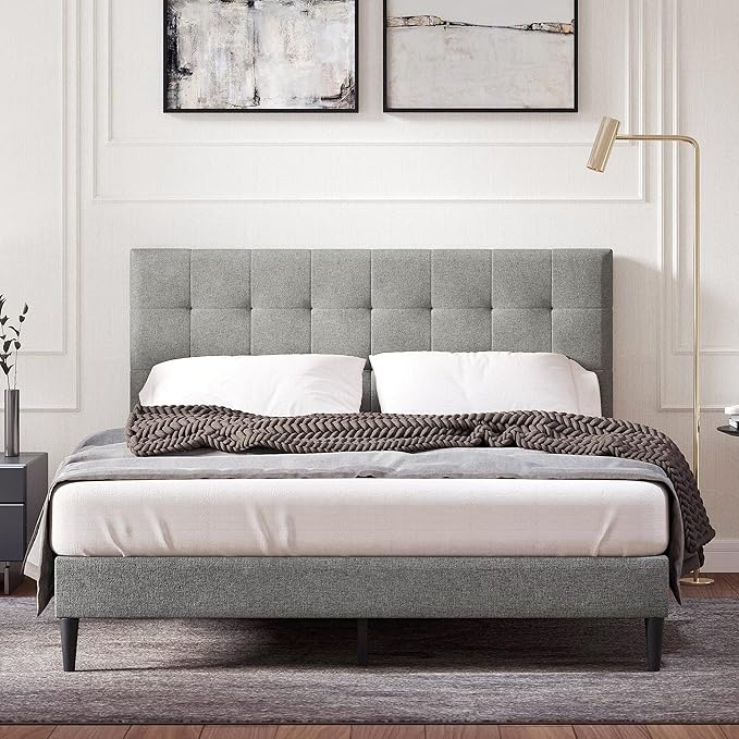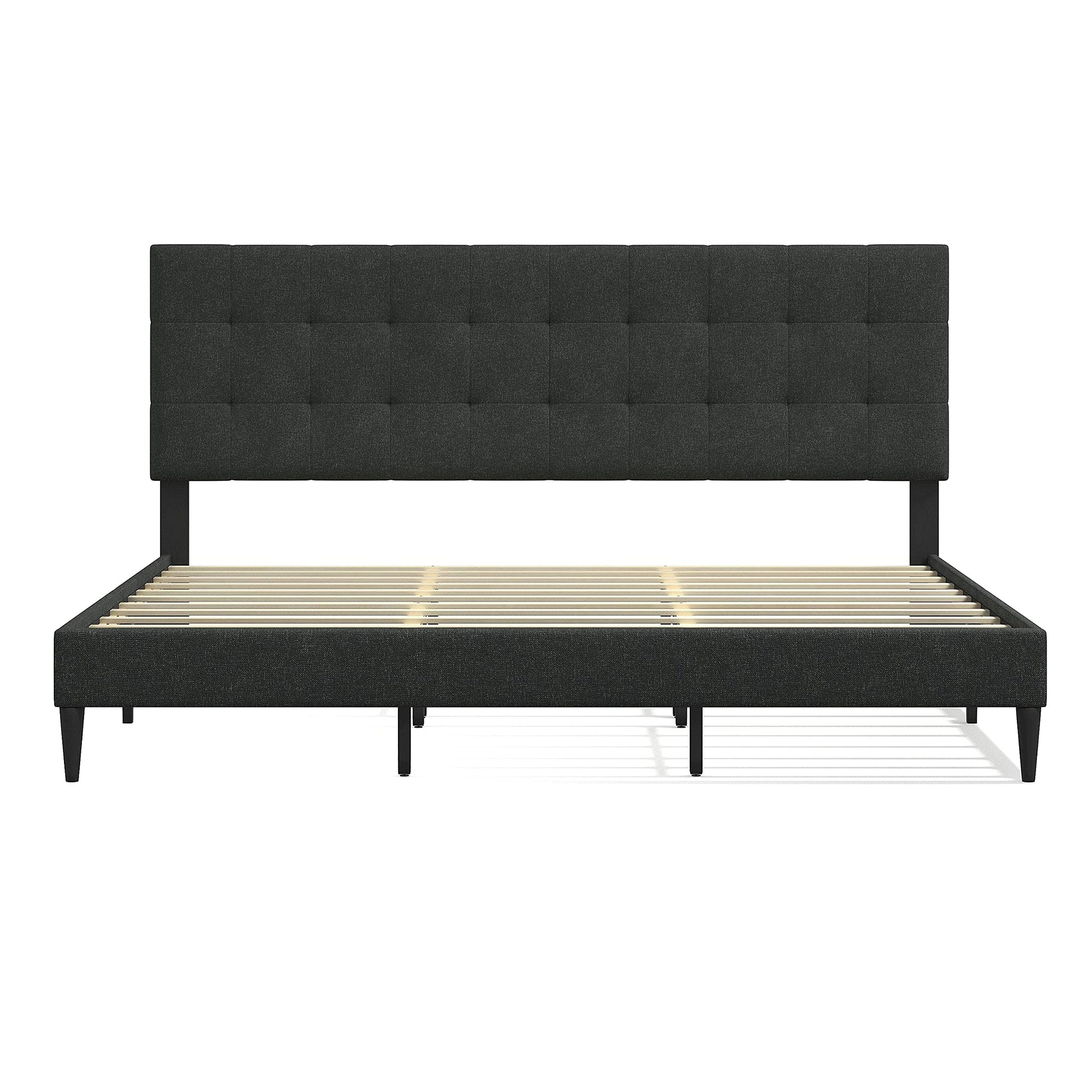 Kaya Upholstered Platform Bed Frame/Buttonless Tufting/Mattress Foundation/Wood Slat Support/No Box Spring Needed/Easy Assembly, Gray, King