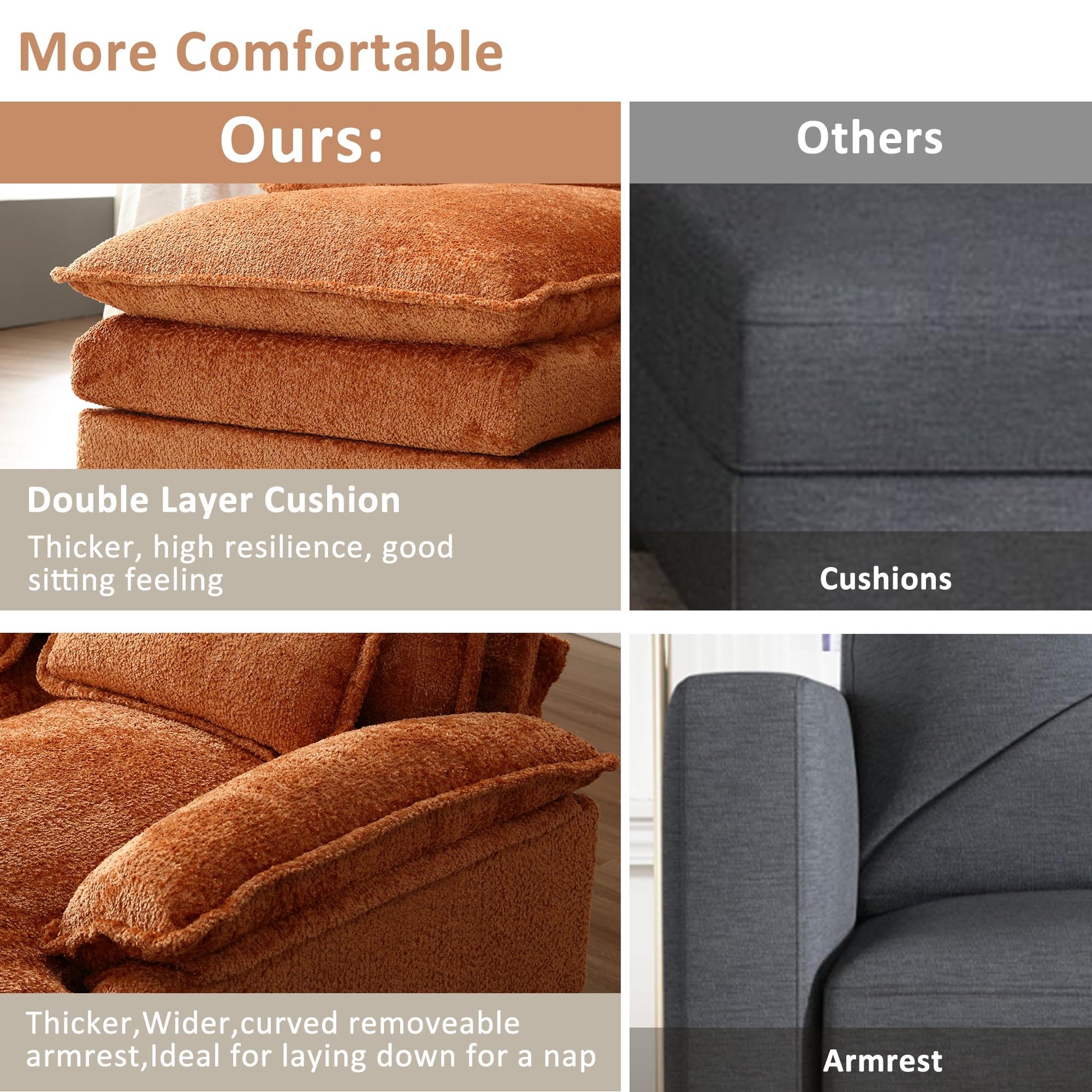 - Comfy Chenille Fabric: The chenille fabric is soft and skin-friendly, providing a soft and comfortable touch and adding a sophisticated and luxurious look to the boucle couch.