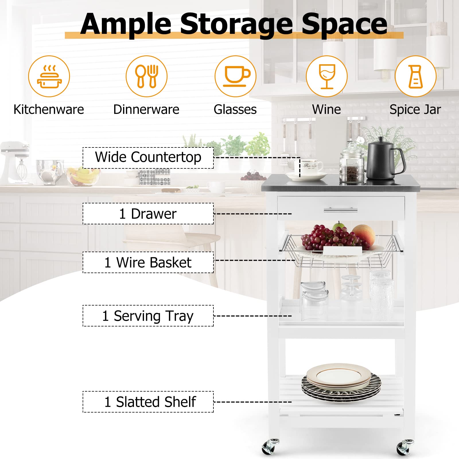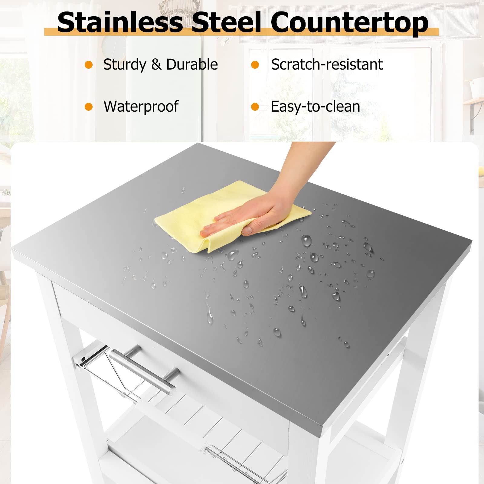 - Different from ordinary kitchen carts with wooden tabletops, our kitchen island cart features a stainless steel countertop that is more sturdy, scratch-resistant and easy-to-clean. It provides you with an additional place to prepare and serve food.