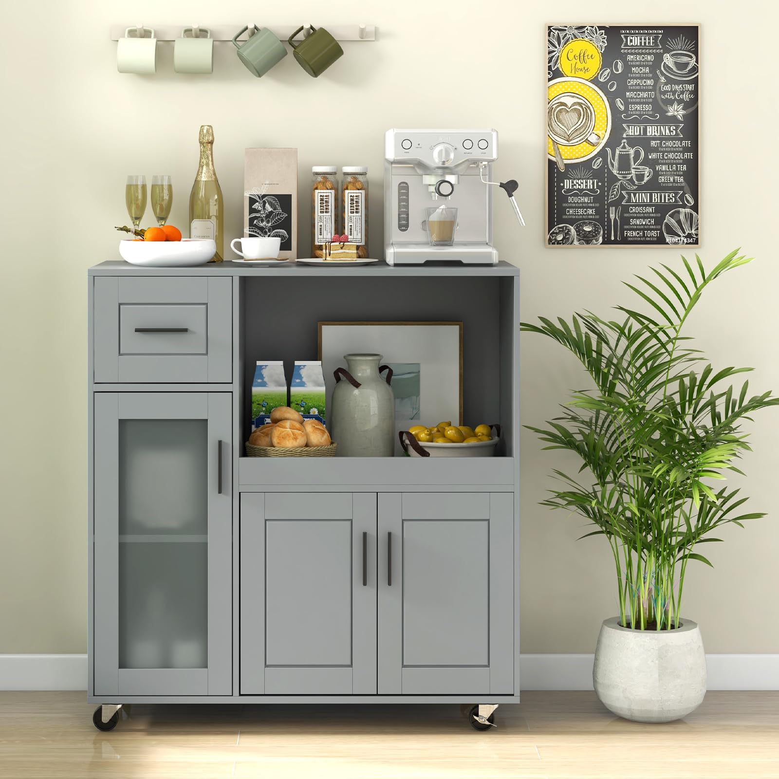 - The 4 360° swivel casters attached to this coffee bar cabinet offer easy movement across your kitchen floors. With 2 lockable wheels, it securely stays in place when needed.