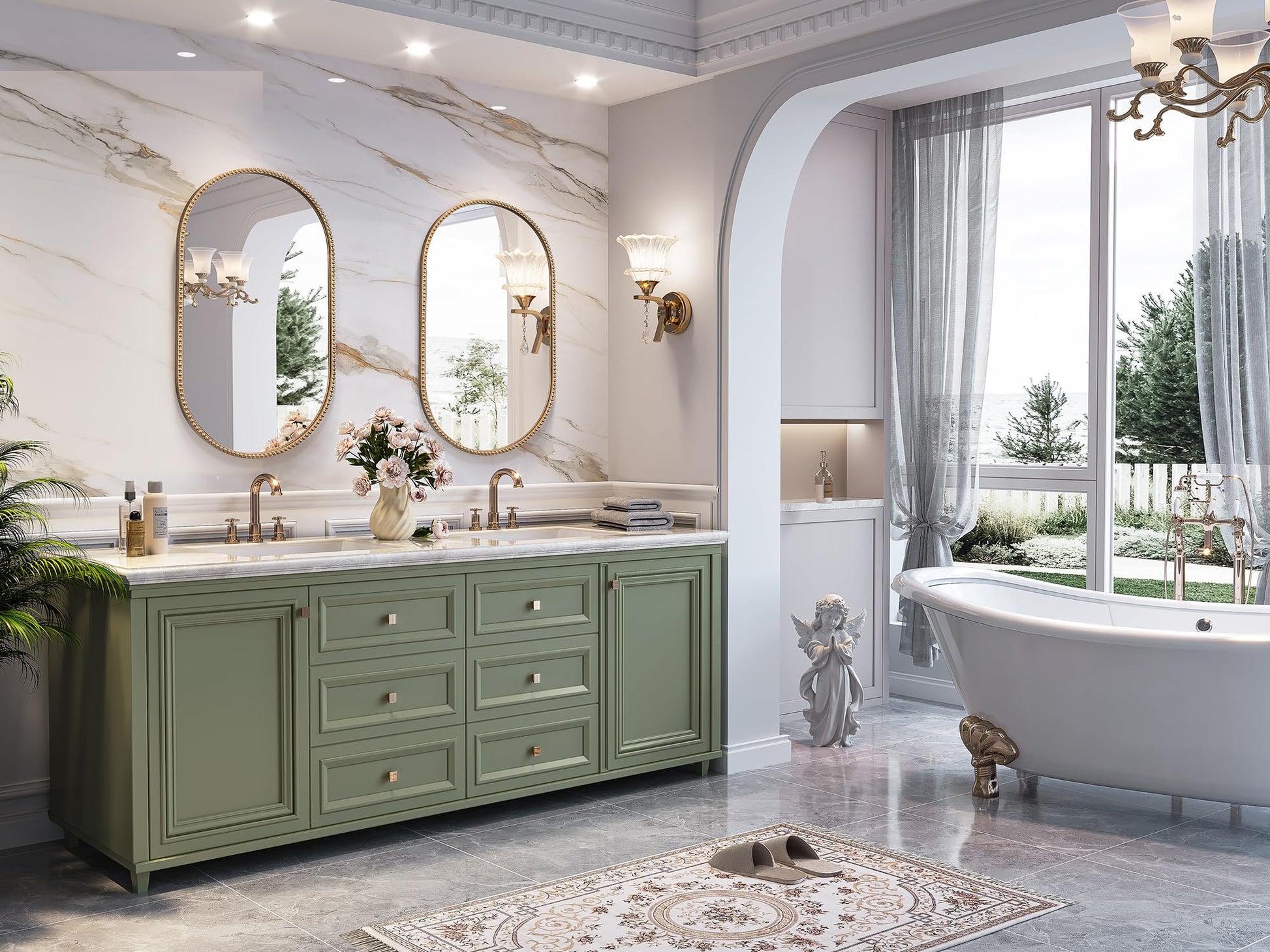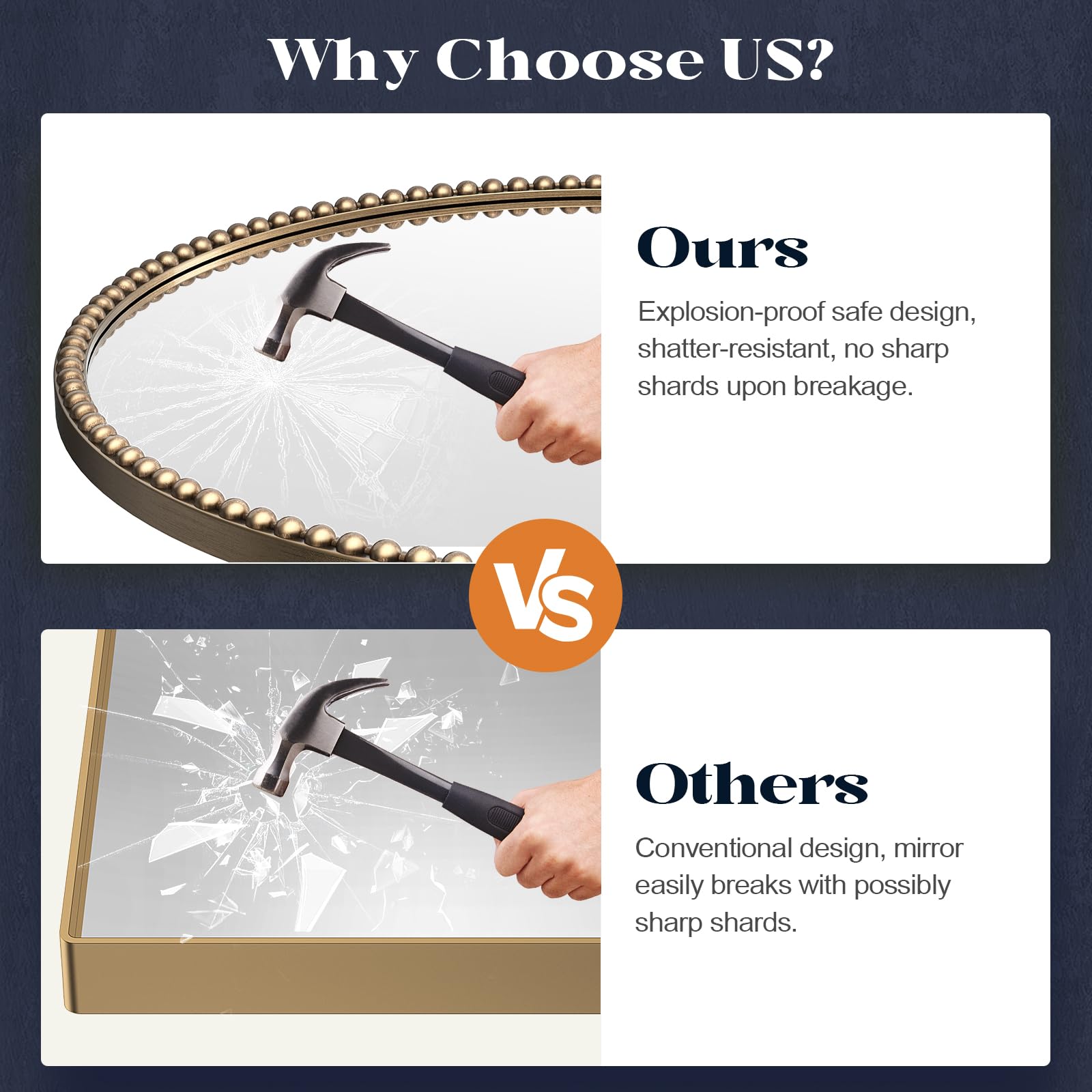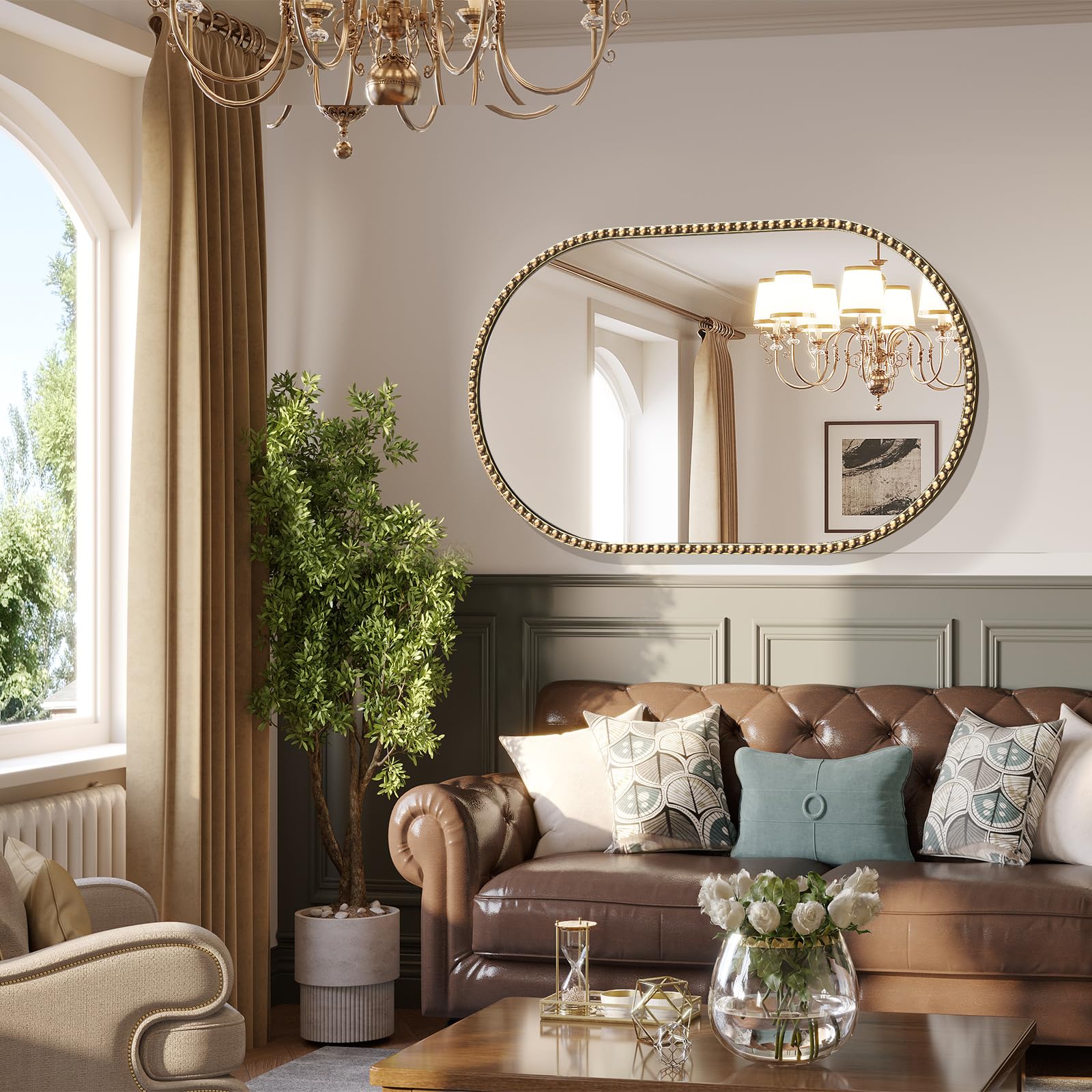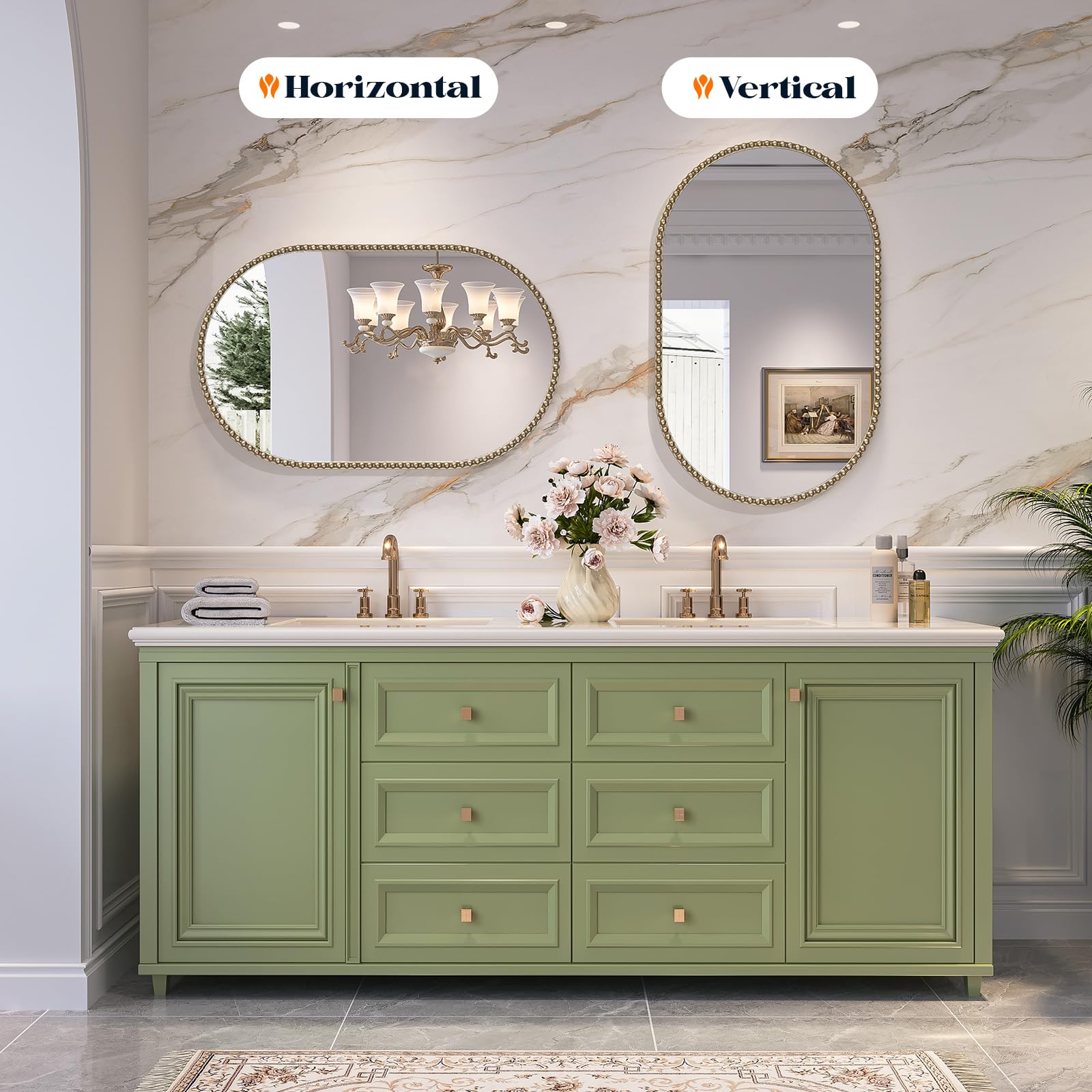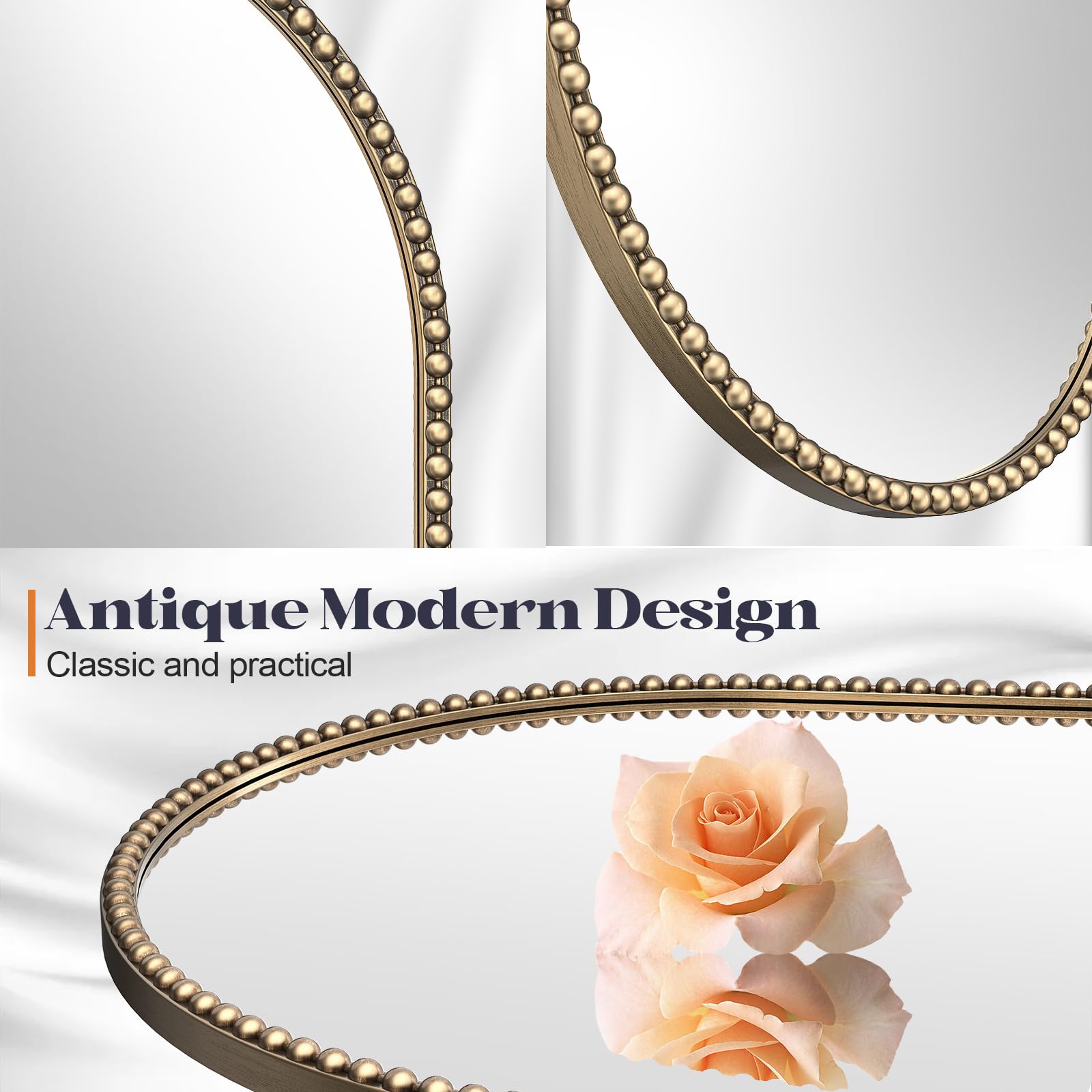 Transform your space with this stunning gold oval mirror featuring intricate beaded detailing and an antique brass finish. The champagne bronze vintage aesthetic adds timeless elegance to any room, from bathrooms and bedrooms to living rooms and hallways.