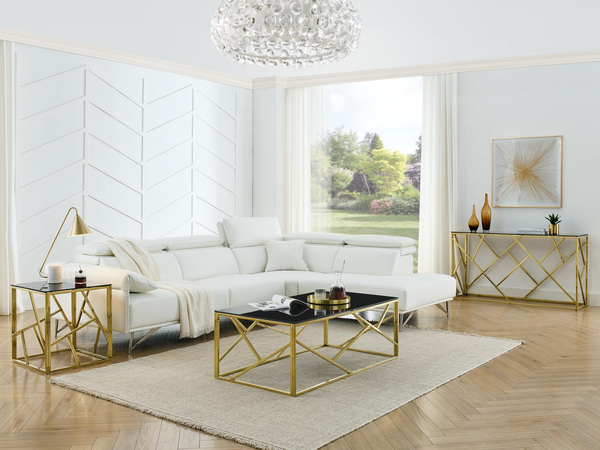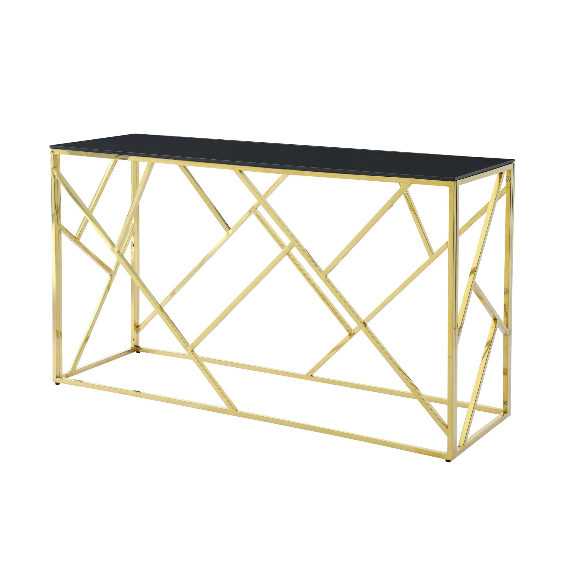 - This stylish console table features a black glass top with gold stainless steel frame to make it a perfect addiction to any home decor. Comes with luxurious appearance and geometric streamline, this rectangular glass sofa table can add elegance and functionality to your living space.