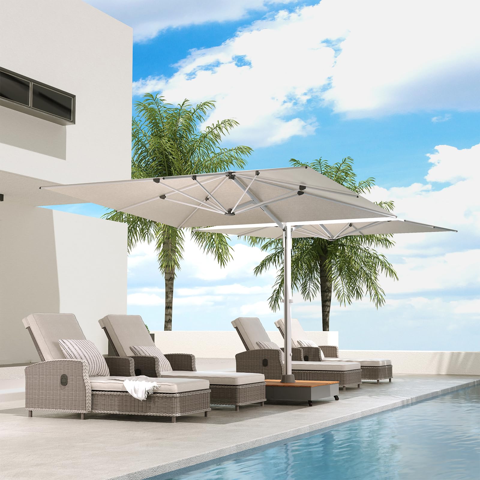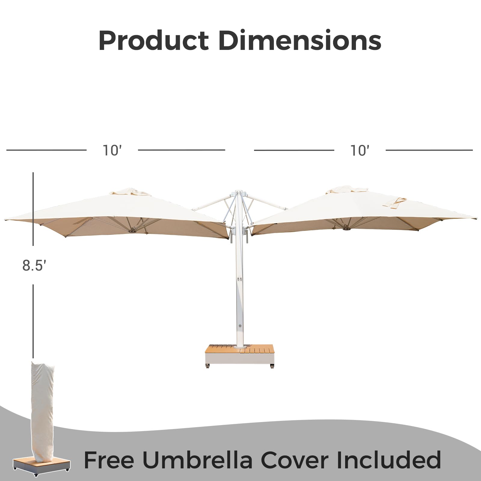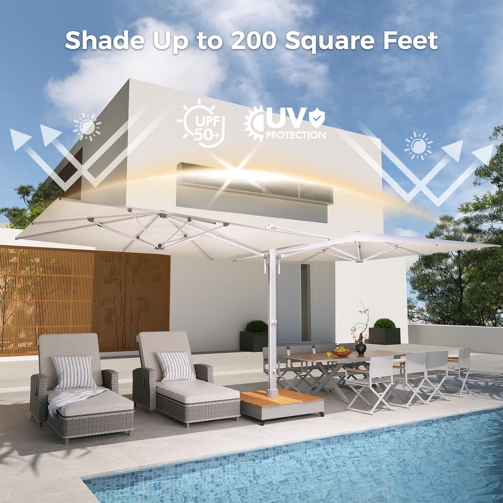- Sunshade Design: Measuring 10' X 10' on each side, this large double-sided square outdoor umbrella can accommodate a 5-piece set with a 48"-54" square table or a 5-person lounge set to provide a wide range of shade for your outdoor area. In commercial applications, multiple umbrellas can be used side by side to maximize shade while enhancing your business's image.