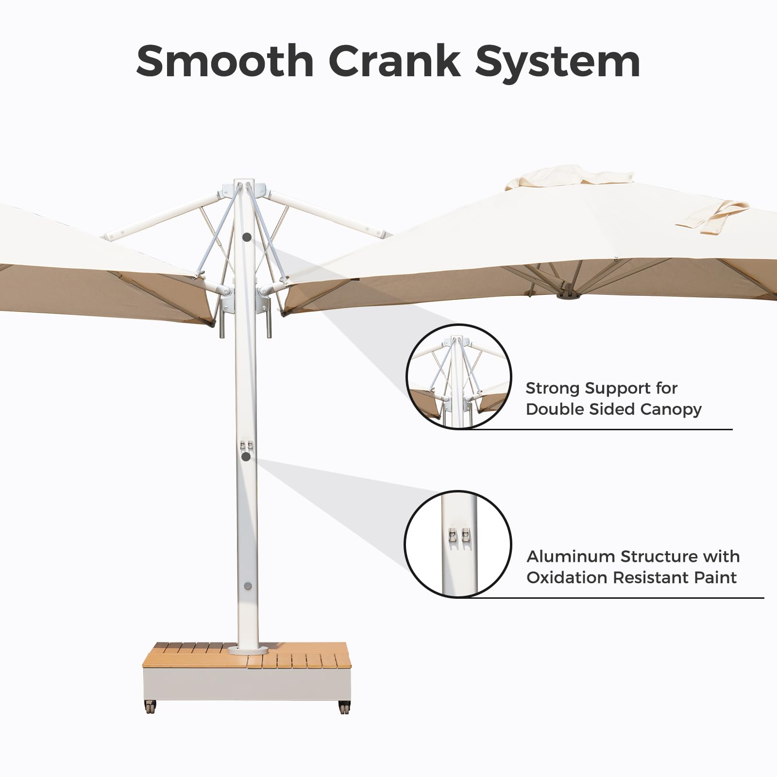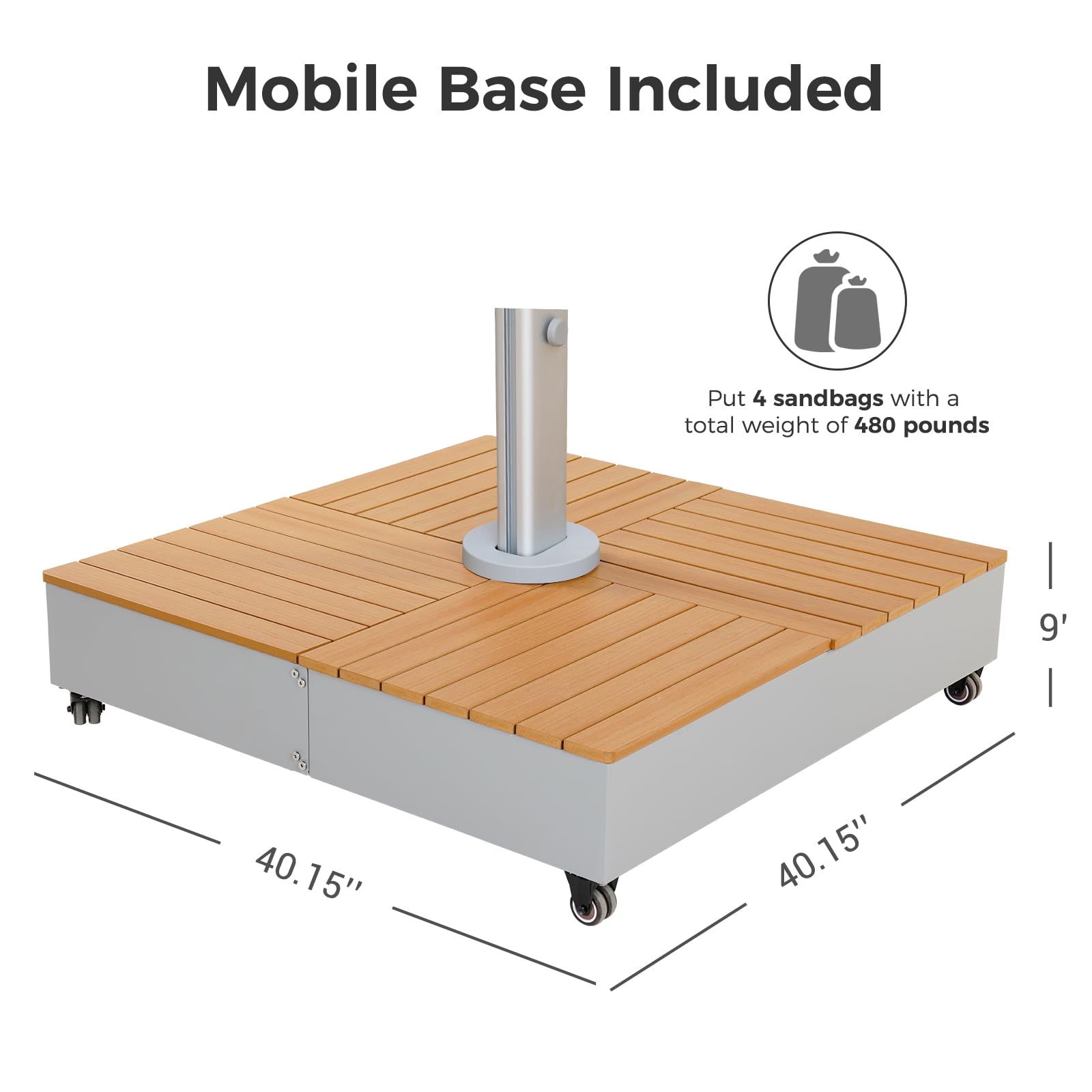 - Mobile Weighted Base Included: Achieve ultimate stability with the umbrella's sturdy base. This 10x10 FT double-sided patio umbrella base features four wheels for easy mobility, and two locking gears for enhanced safety. With a steel frame and faux wood grain PS slats top, this base can hold 4 sandbags with a total weight of 420 pounds for optimal stability.