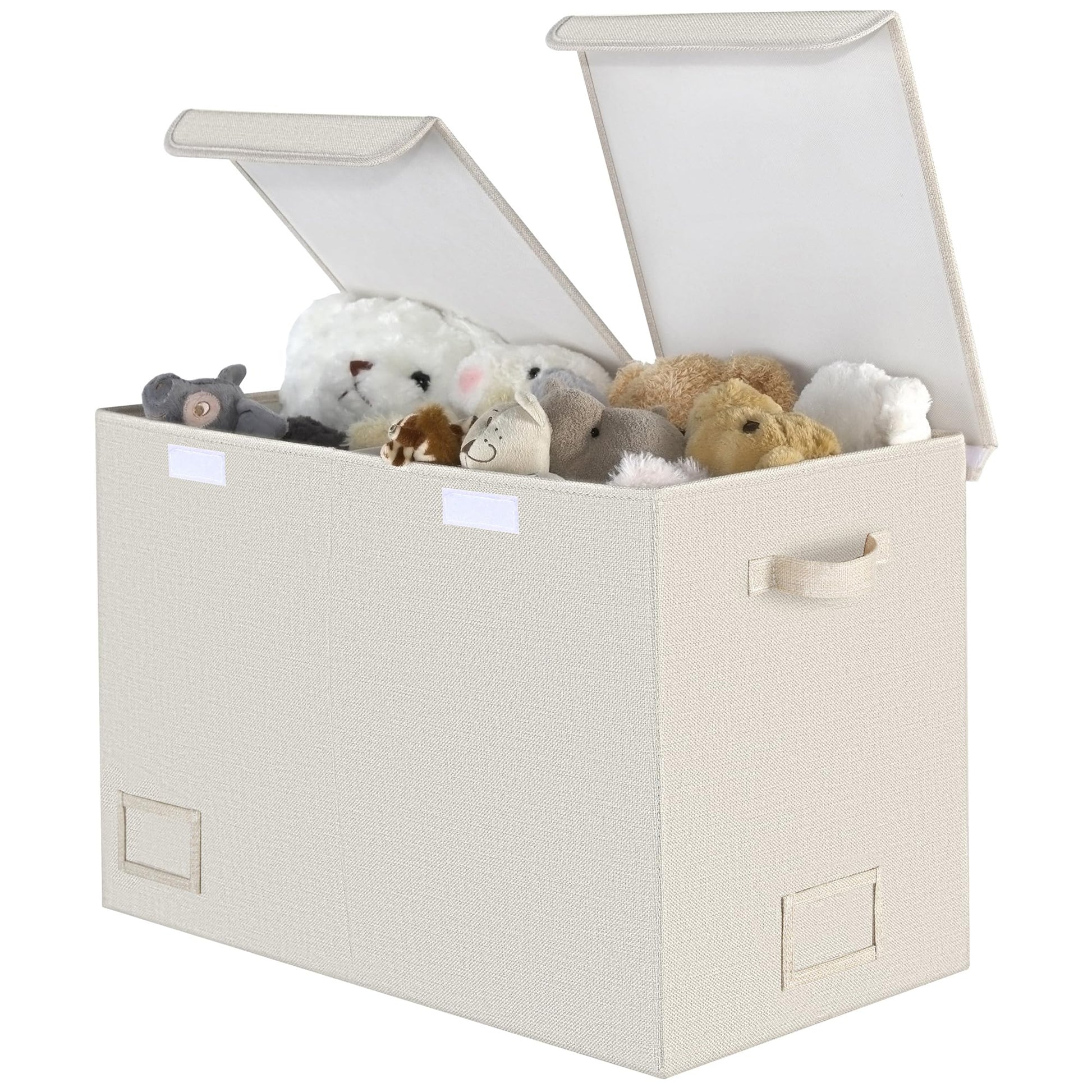 - Divider, Label Pockets & Hook-Loop - Toy boxes for kids extra large come with a removable center divider, allowing for high-capacity storage or 2-section storage. Transparent label pockets make it easy to categorize and organize items, while the lids with hook-and-loop closures are simple to open and close.
